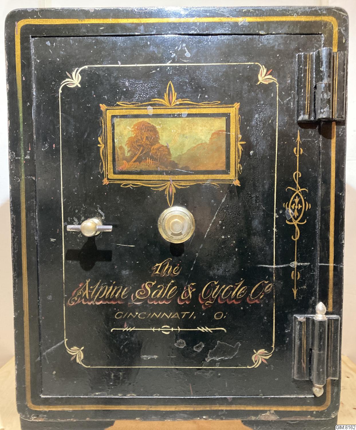 Kassaskåp; svartlackerad, gulddekor, målat landskapsmotiv på dörren, kombinationslås för siffror