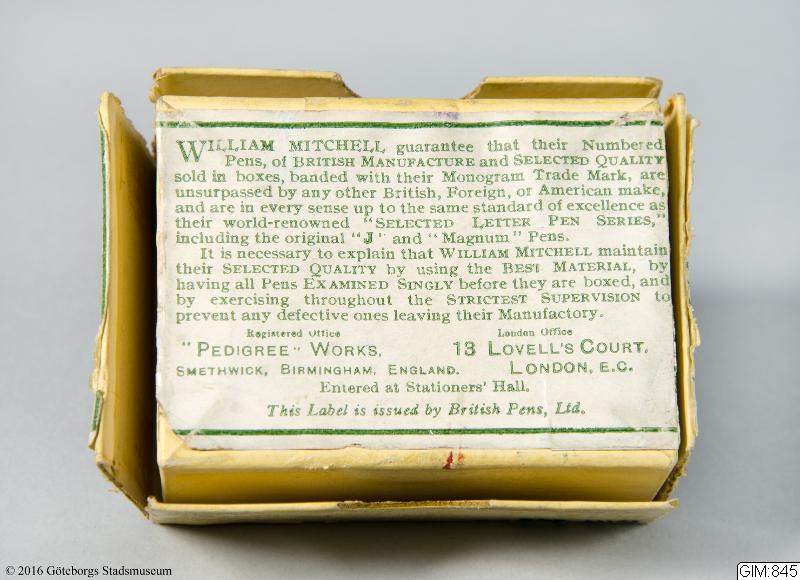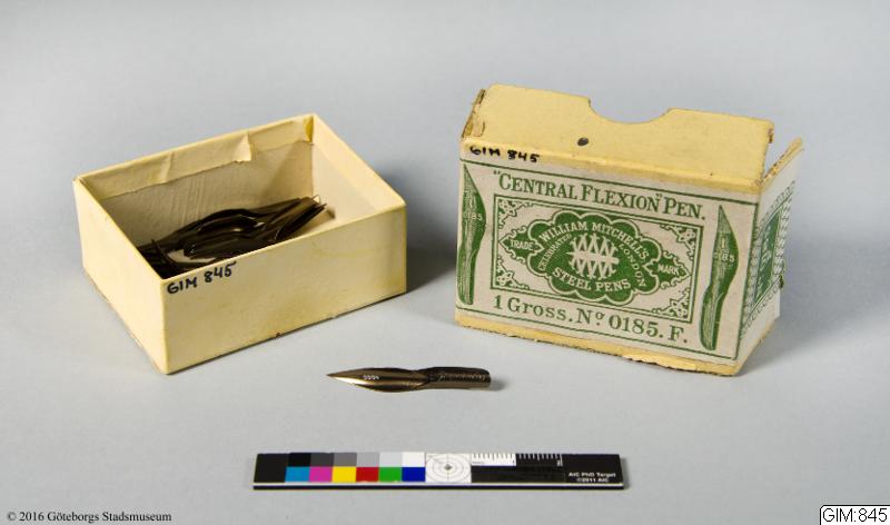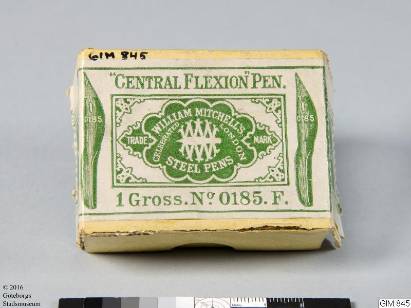 1 gross. Steel pens. Kartongen är gul med grön etikett.