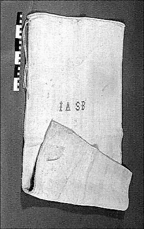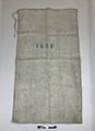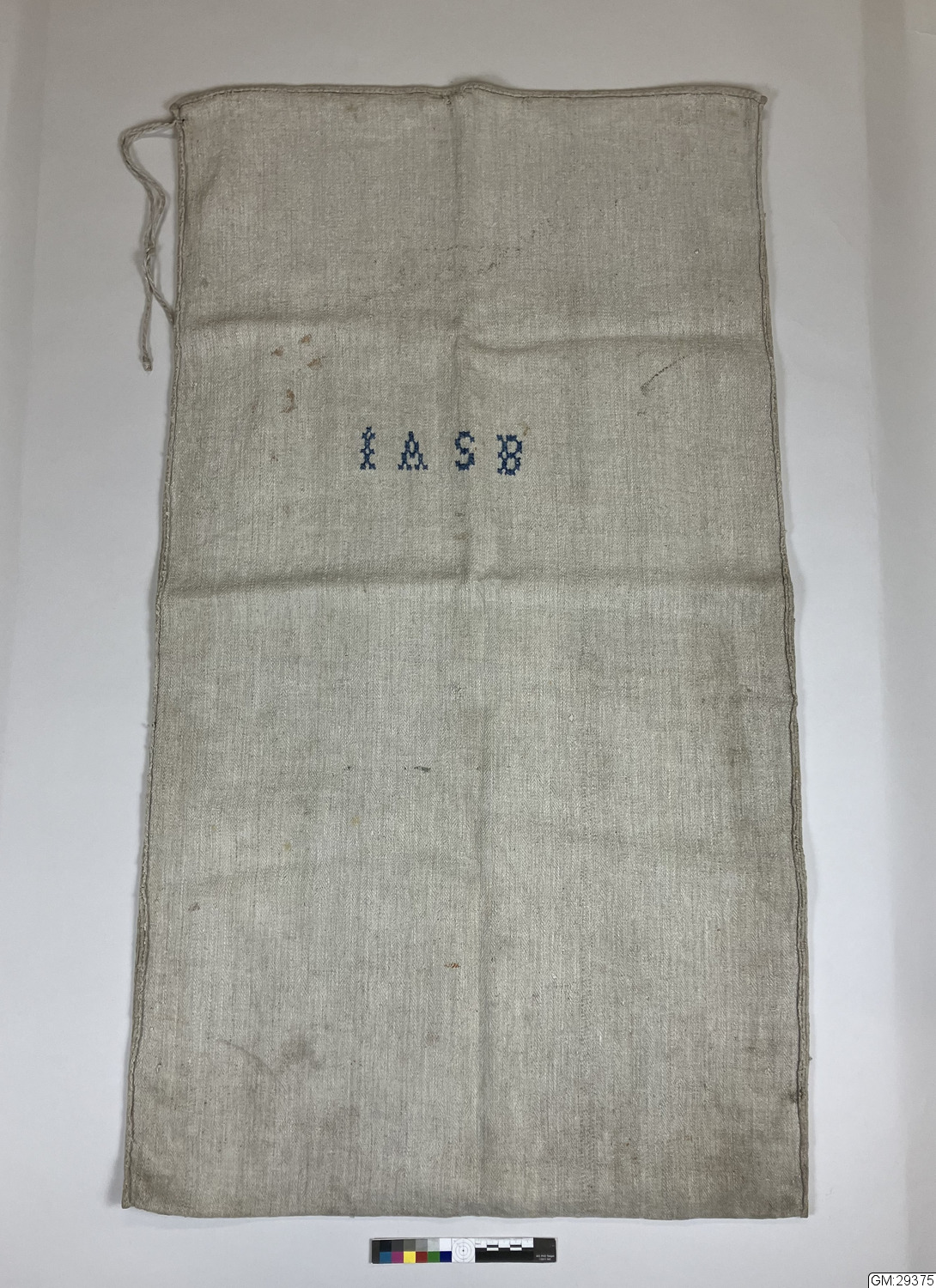 Mjölsäck av grovt handvävt linne, kypertvävt. Märkt med stora korsstygn i ljusblått bomullsgarn# "L A S B."