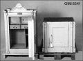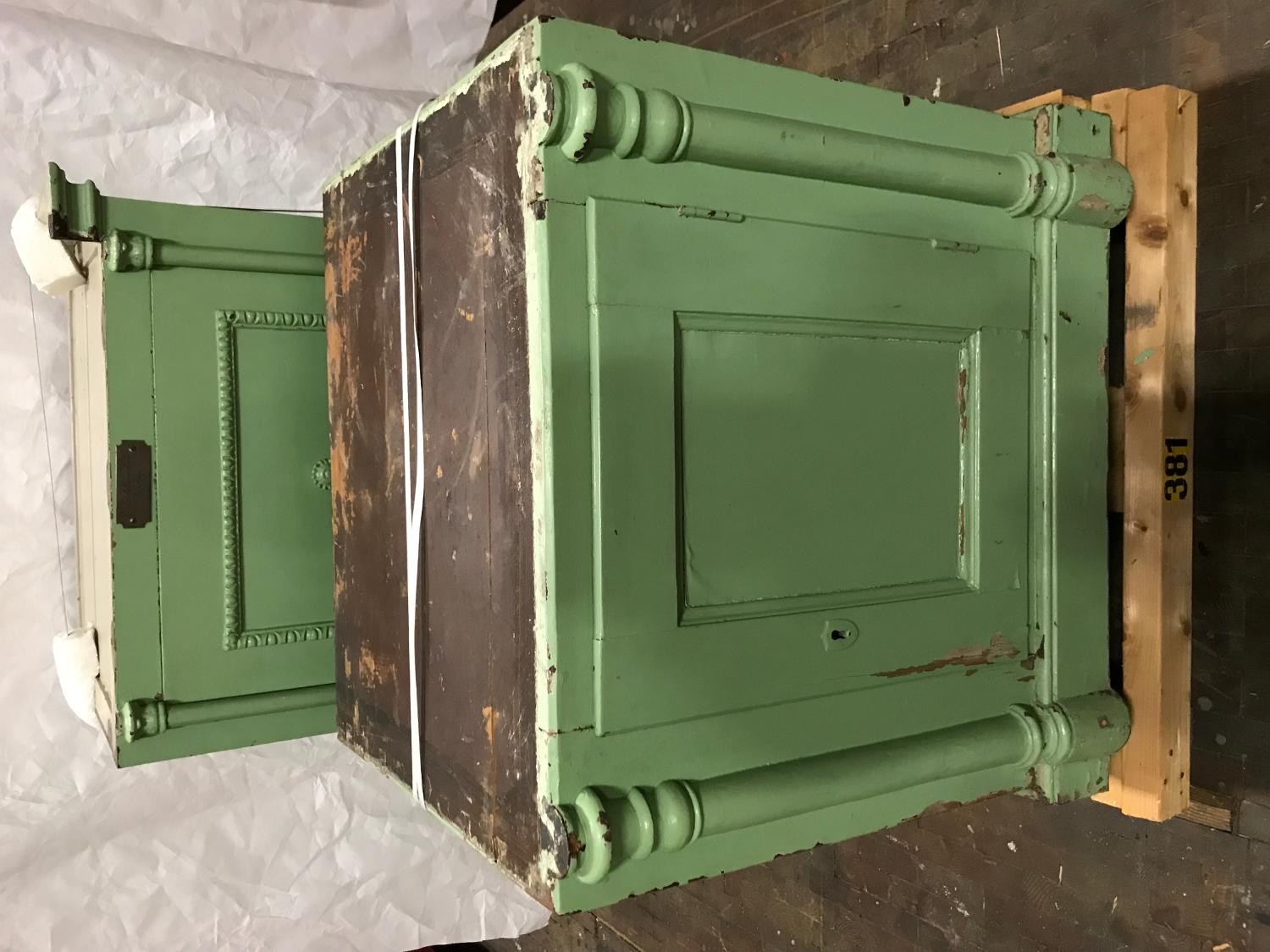 - Grönmålat stålskåp med underdel av trä. 4 st nycklar medföljer. Överdelens dekorlist bruten i 4 delar, mässingskylt med tillverkarens namn sitter under listen och facken på insidan är målade i lila med guld dekorering.