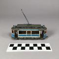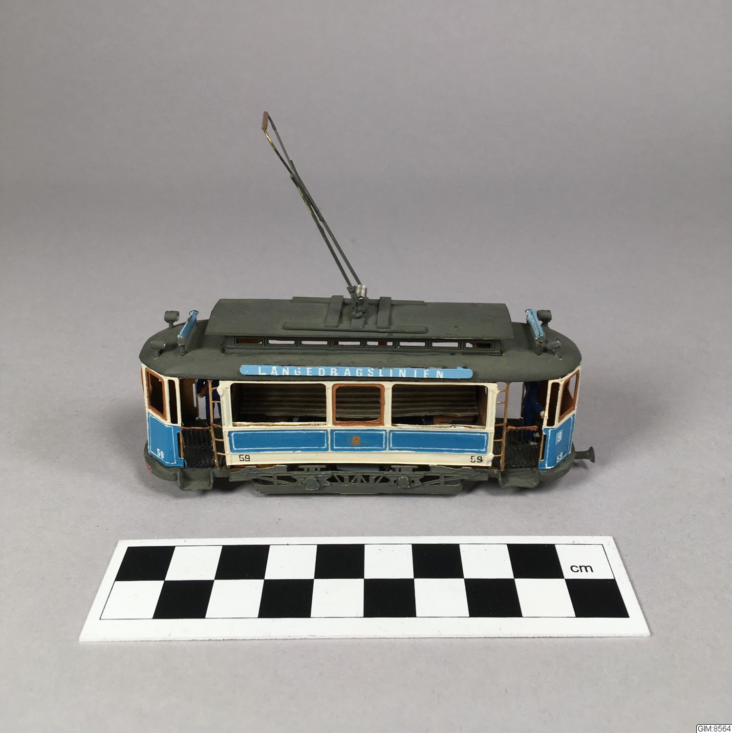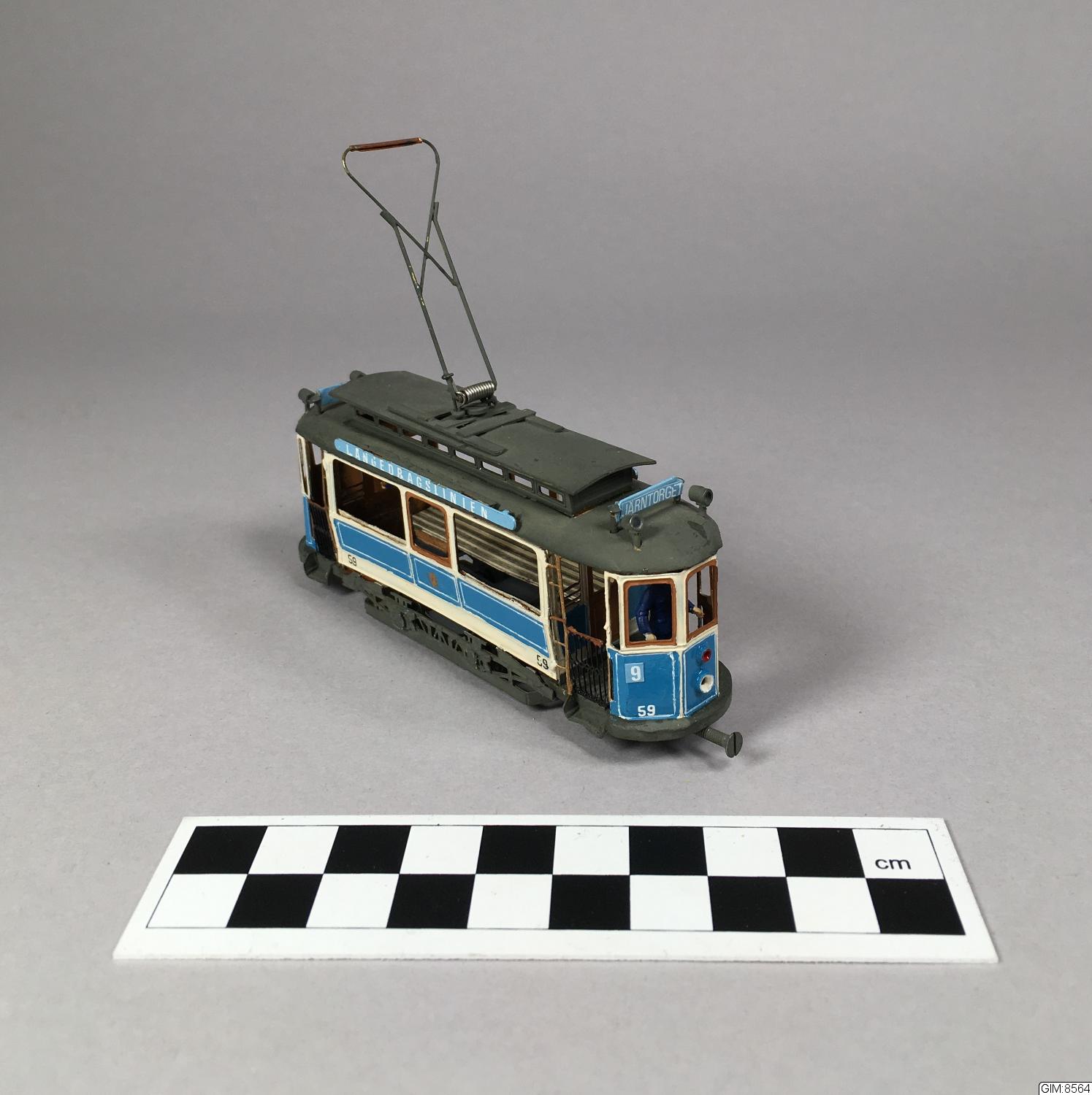 - Modell av Göteborgs Spårvägars motorvagn 1908, typ M4. Ex 59. Med förare och konduktör. Ljusblå linjeskylt längs taket "Långedragslinjen", ljusblå frontskylt "Järntorget", akterskylt "Långedrag"