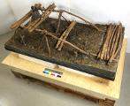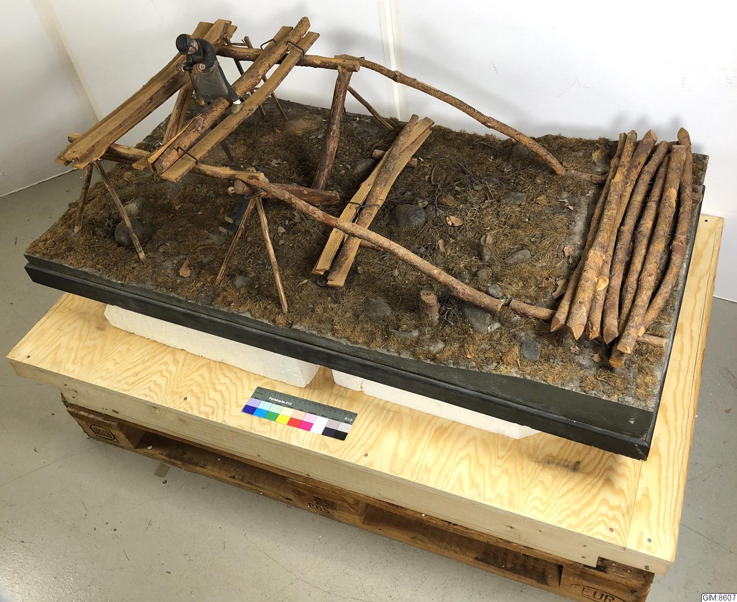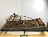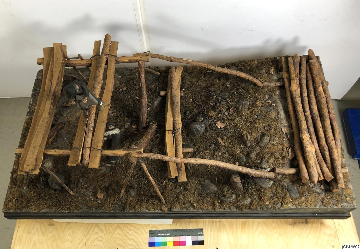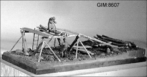 - Modell av kransågning: två män sågar en stock till bräder. Stocken lagd på hög bock, där den ene står uppe på bocken, den andre under. Kransågen lär ha fått sitt namn av sågens form med förlängda handtag som anses likna en trana (kran)
