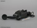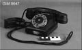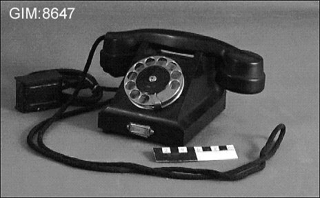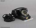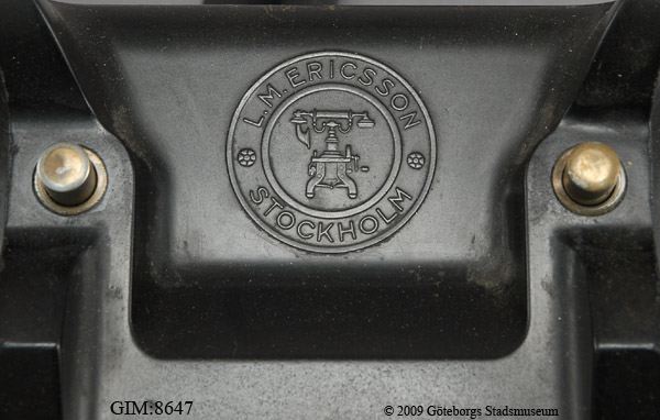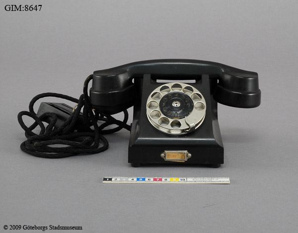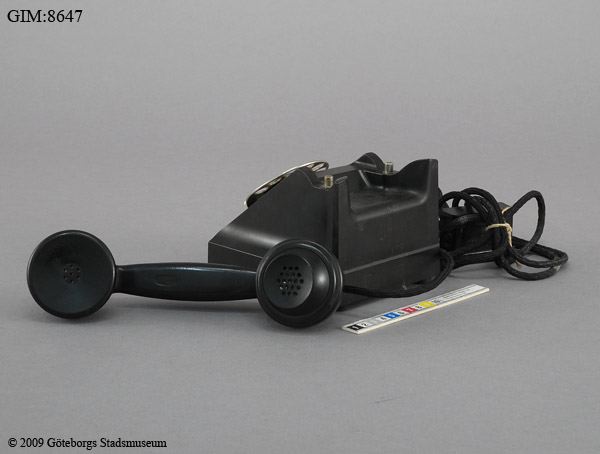 - Svart bordstelefon med fingerskiva. På telefonen under luren finns ett cirkelformat firmamärke "L.M ERICSSON STOCKHOLM", i mitten en telefon. På luren finns en oval ram med "L.M. Ericsson Stockholm" Nummerskiva i metall. Kablage med väggkontakt. Textilklä