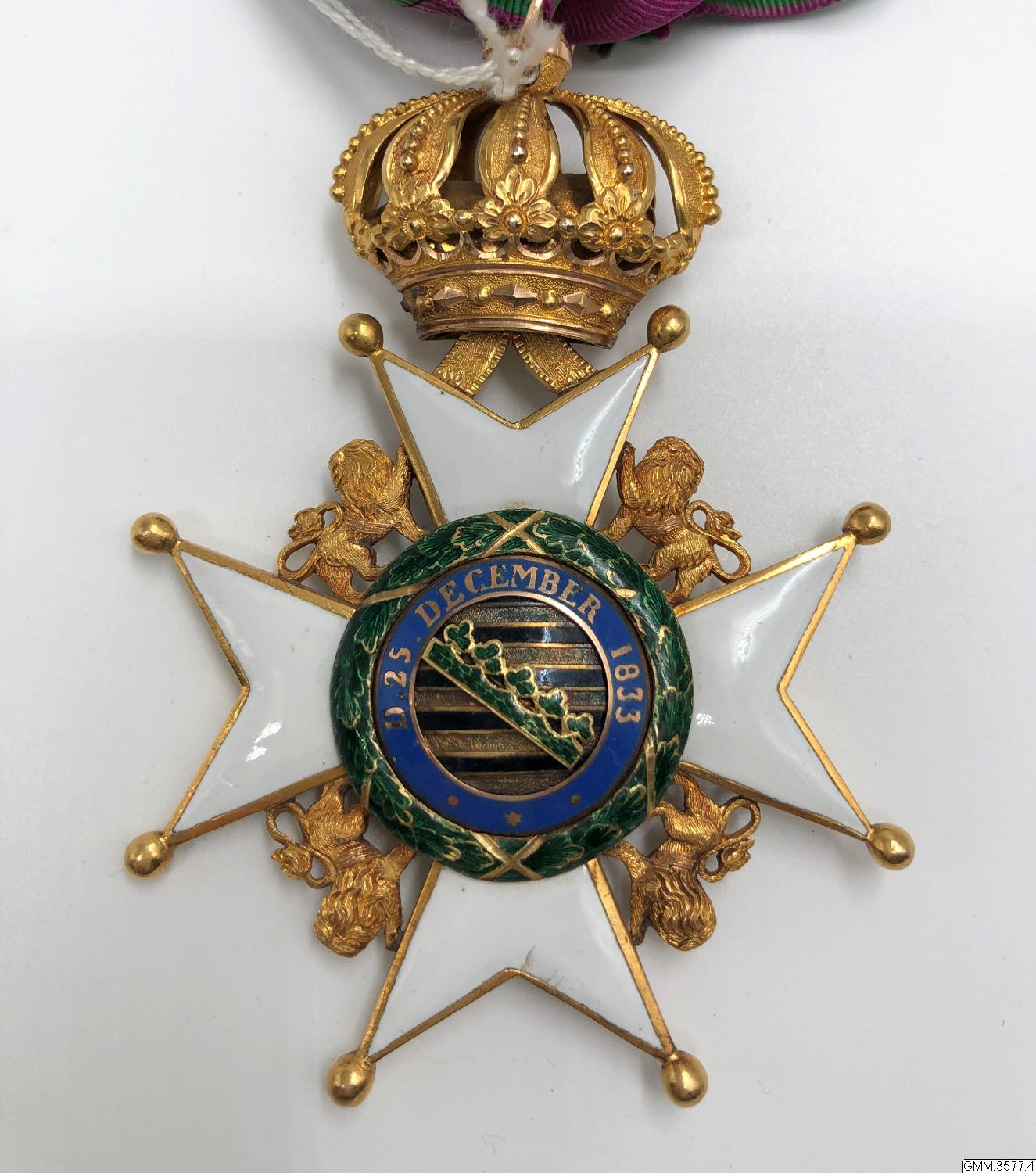 Hertigliga Sachsen Ernestinska husordens kommendörstecken i halsband, guld (18k) och emalj. Tilldelat och buret av riksheraldikern Carl Arvid Klingspor 1829-1903./ctn