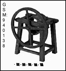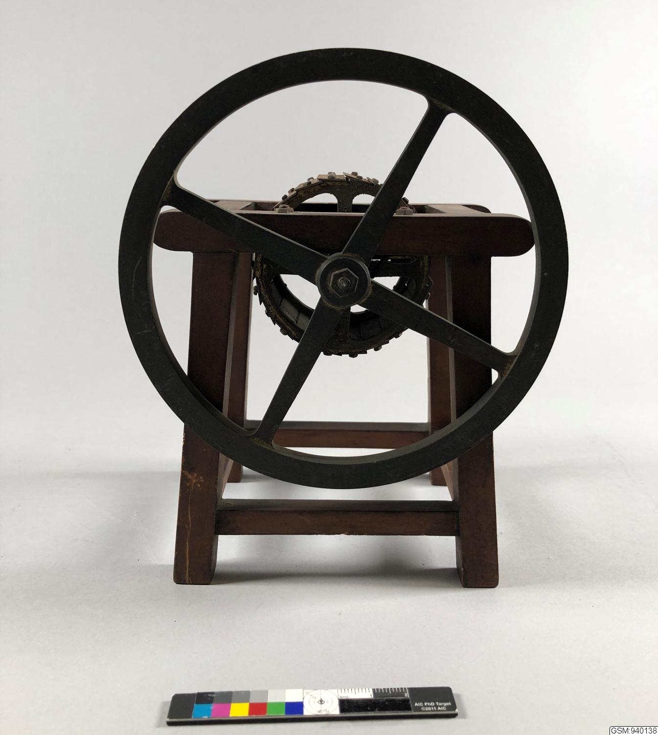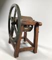 Modell med trumma med snedställda skovlar, stort hjul på trumaxeln samt vev. Okänd användning.