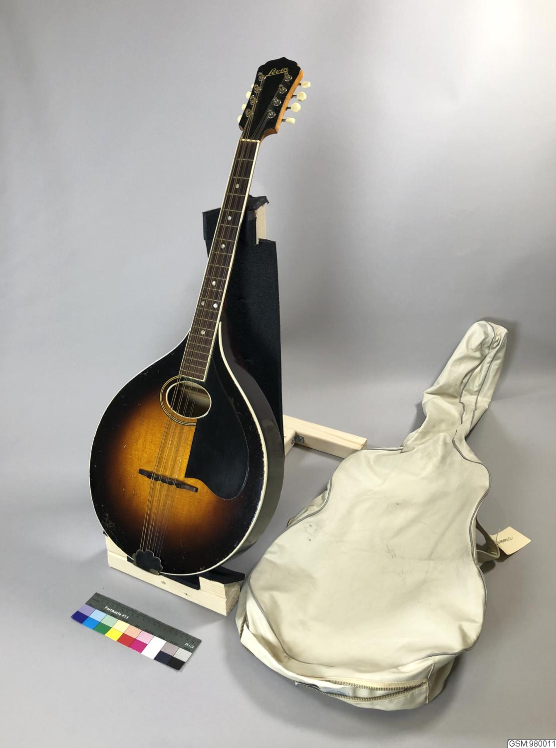- åttasträngad med lock av gran, korpus av lönn. Botten i ett stycke och svagt välvd. Glansig mörkbrunlack med genomlysta partier centrum av locket samt praktiskt taget hela halsen. Locket har vit plastlist runtom. Greppbräda av jakaranda med 20 metallband samt 7 runda markeringar av pärlemor. Löst stall av jakaranda. Ovalt ljudhål med inläggningsådrar i gul/svart. Plektumskydd i svart plast pålimmat. Stränghållare av förnicklad mässing går som skydd upp mot locket. Tvåkoriga strängar, sex stycken är spunna. Skruvlåda med stämskruvar i vit plast.I förgylld skrivstil "Levin". På lockets insida Levins garantisedel. Det finns diverse lackskador, krackelering på locket. Begynnande spricka börjar vid den lägsta stämskruvarna. Där finns också "AÄ" inristat. God ton.