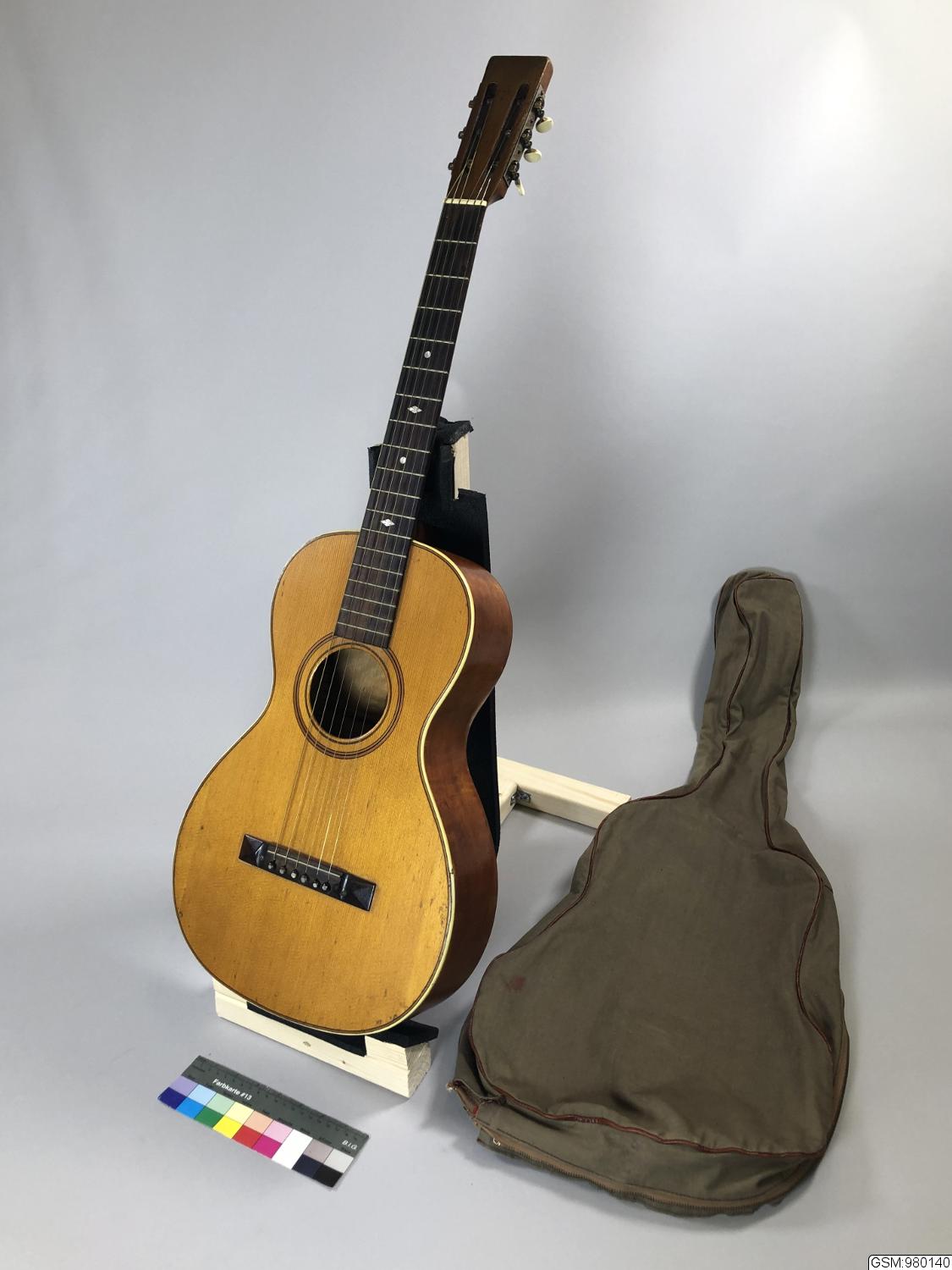 6-strängad, med platt botten. Gran i lock och botten med sarg av lönn. Runt ljudhål kring vilket flera inläggningsådrar är gjorda - en större dubbel med rött och svart samt en mindre inanför i svart och guld. Vit beninläggning runtom sargen samt inläggningsåder i rött och guld. Stränghållaren av jakaranda är limmad och skruvad på locket. Strängar av metall, varav fyra spunna av gulmetall. De något olika strängpluggarna av trä, som är något olika, har pärlmoinläggning. Greppbräda av jakaranda med 18 metallband samt fyra typiska Levin-inläggningar av pärlemor. Stämskruvar med vit konstmassa riktas bakåt. Hållare för band av brunt trä nedtill. #Tillstånd vid förvärv: Matt ljus lack på locket, rödbrun på korpus och brun på halsen. De senare något glansigare. Beninläggningen skadad mitt på en av långsidorna, nötmärken. I övrigt normalt slitage. Något vidgad limfog i botten. Levinmärket på skruvlådan saknas. I stället finns en rund isättning, fasttejpad med namnet Lindy Larsson skrivet med bläck/filtpenna. God klang.