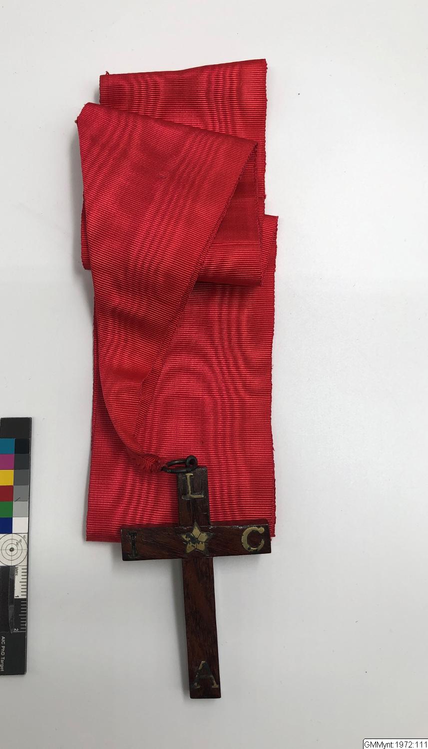 - träkors i rött sidenband, graddeloration inom sällskapet Göta Coldinuorden. Buret av landshövding Malte Jacobsson.