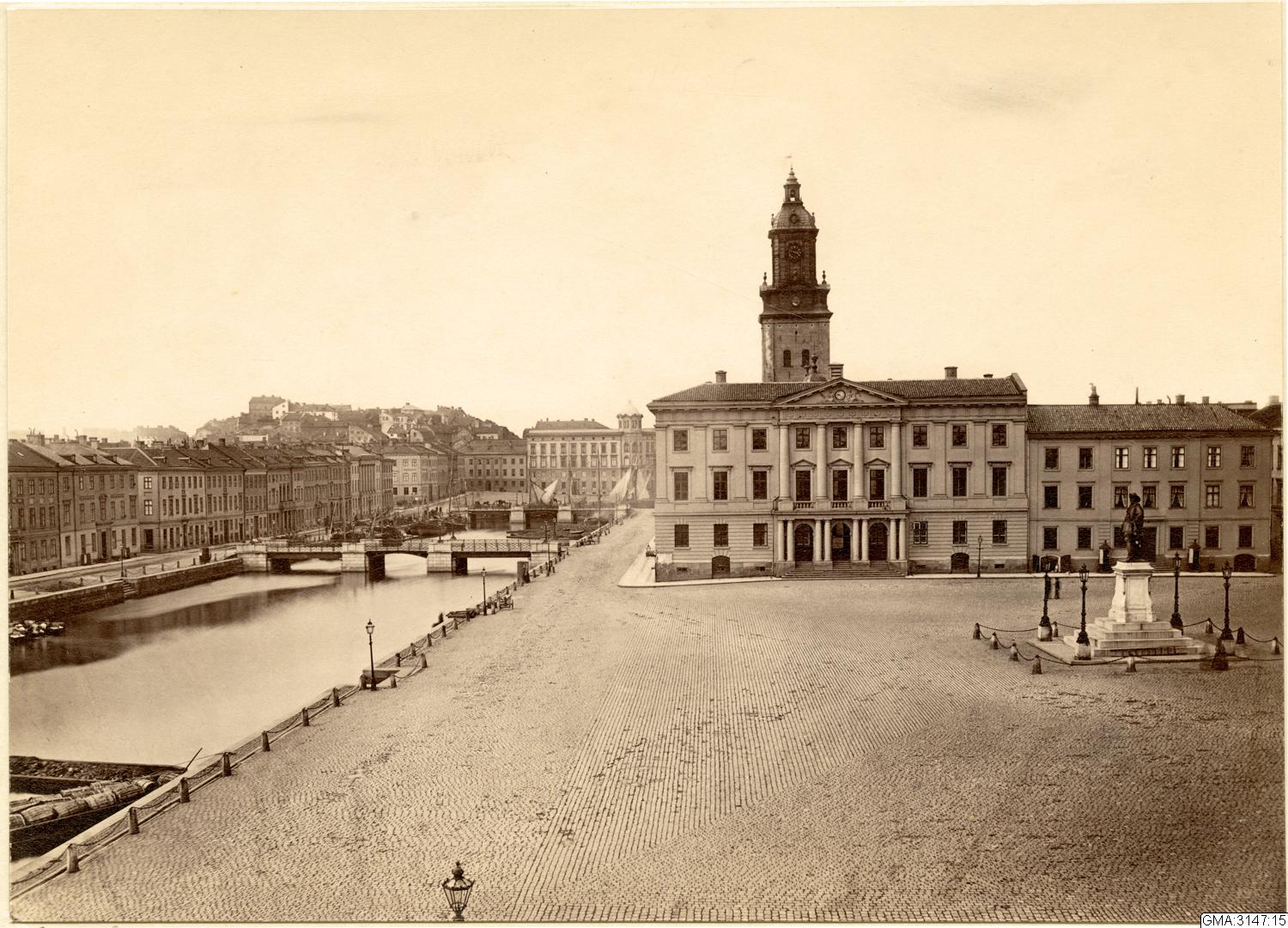 Gustav Adolfs torg, västra delen med Rådhuset och Kommendantshuset Gustav Adolfstatyn. Till vänster Stora Hamnkanalen och Södra Hamngatan. I fonden Lilla Torget och Stora Otterhällan. Fotot taget från Östra Hamngatan 34.