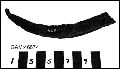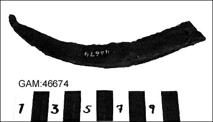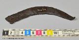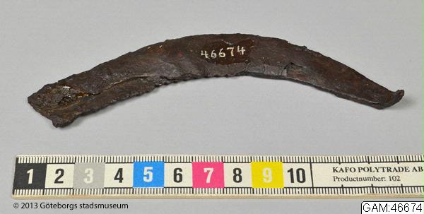 1 st skära av metall. 10,2 cm bred och 2 cm hög.; Skära av järn, övre delen, spetsen avbruten, ena sidan sågtandad.