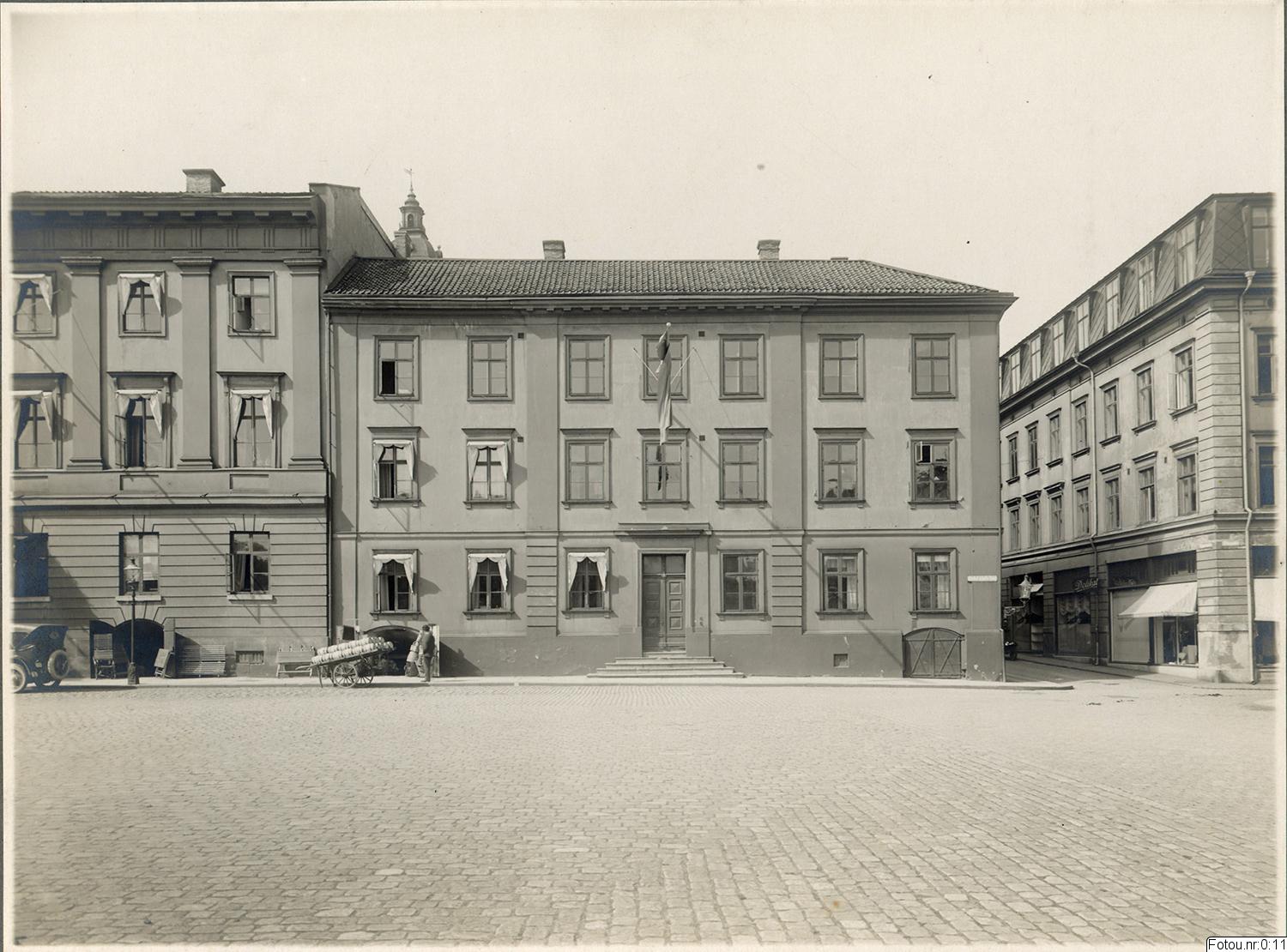 torg; kärra; bil; man; flagga; gatubelysning; källare; rådhus; kommendanthus