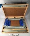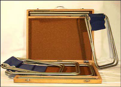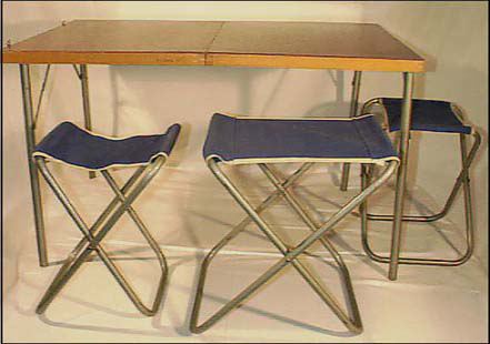 - Set med campingmöbler: hopfällbart bord som bildar en väska innehållande två stora och två mindre fällpallar