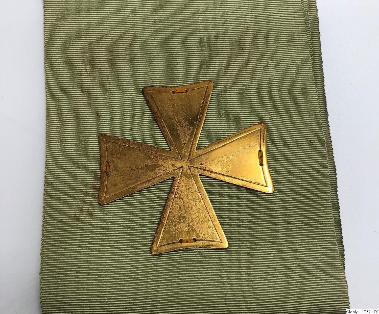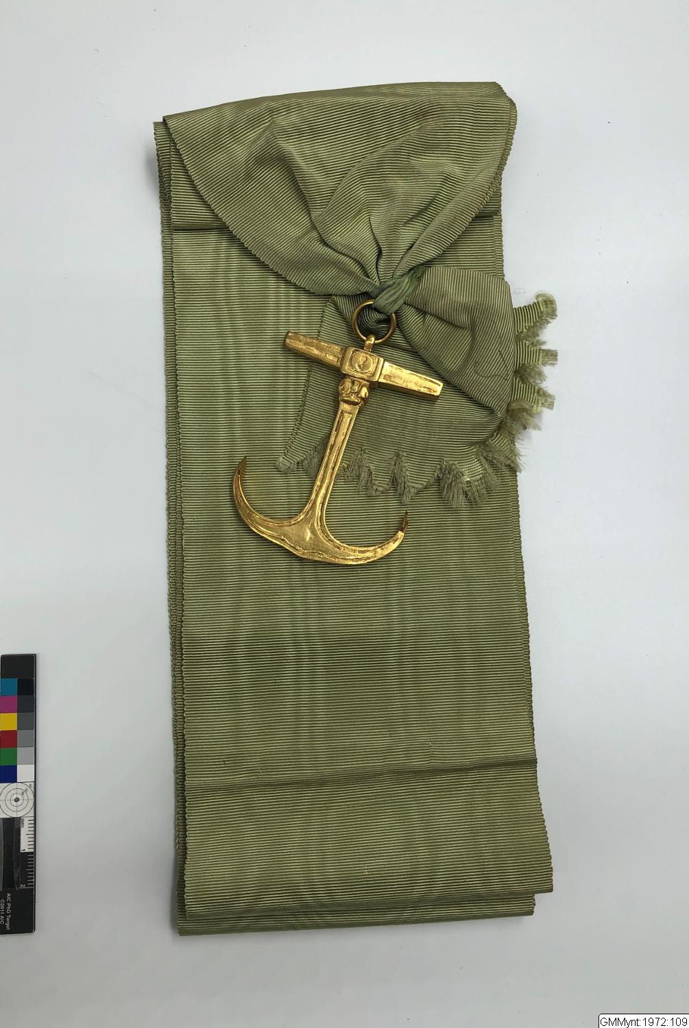 - graddekoration i grönt axelband från ordenssällskapet Coldinuorden, Göteborg i vilket landshövding Jacobsson var medlem. Mitt frampå bandet fäst ett förgyllr georgeskors, i bandets ena ända fäst ett förgyllt ankare.