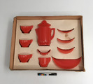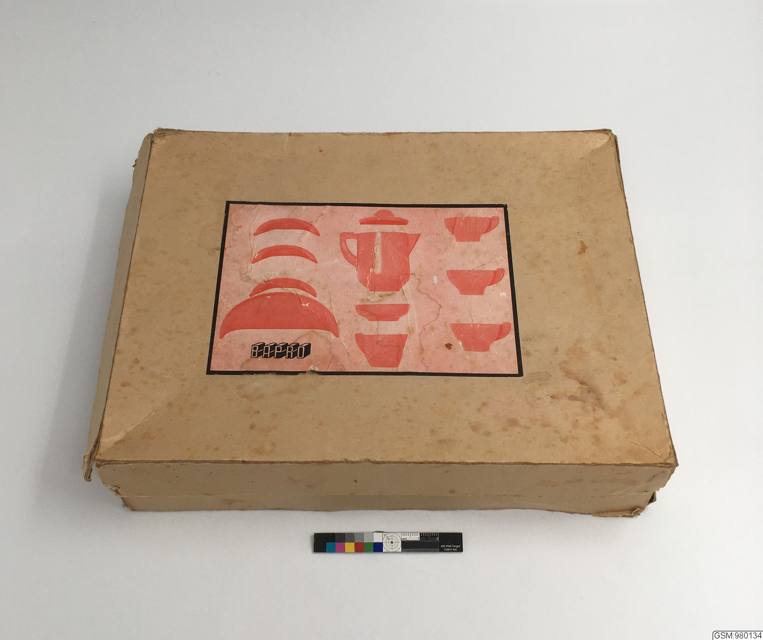 dockservis i originalkartong med pappinsats för de olika delarna: kaffekanna m lock, brödfat, sockerskål, gräddkanna, kaffekoppar m fat, 3 st