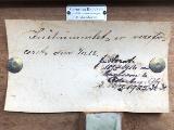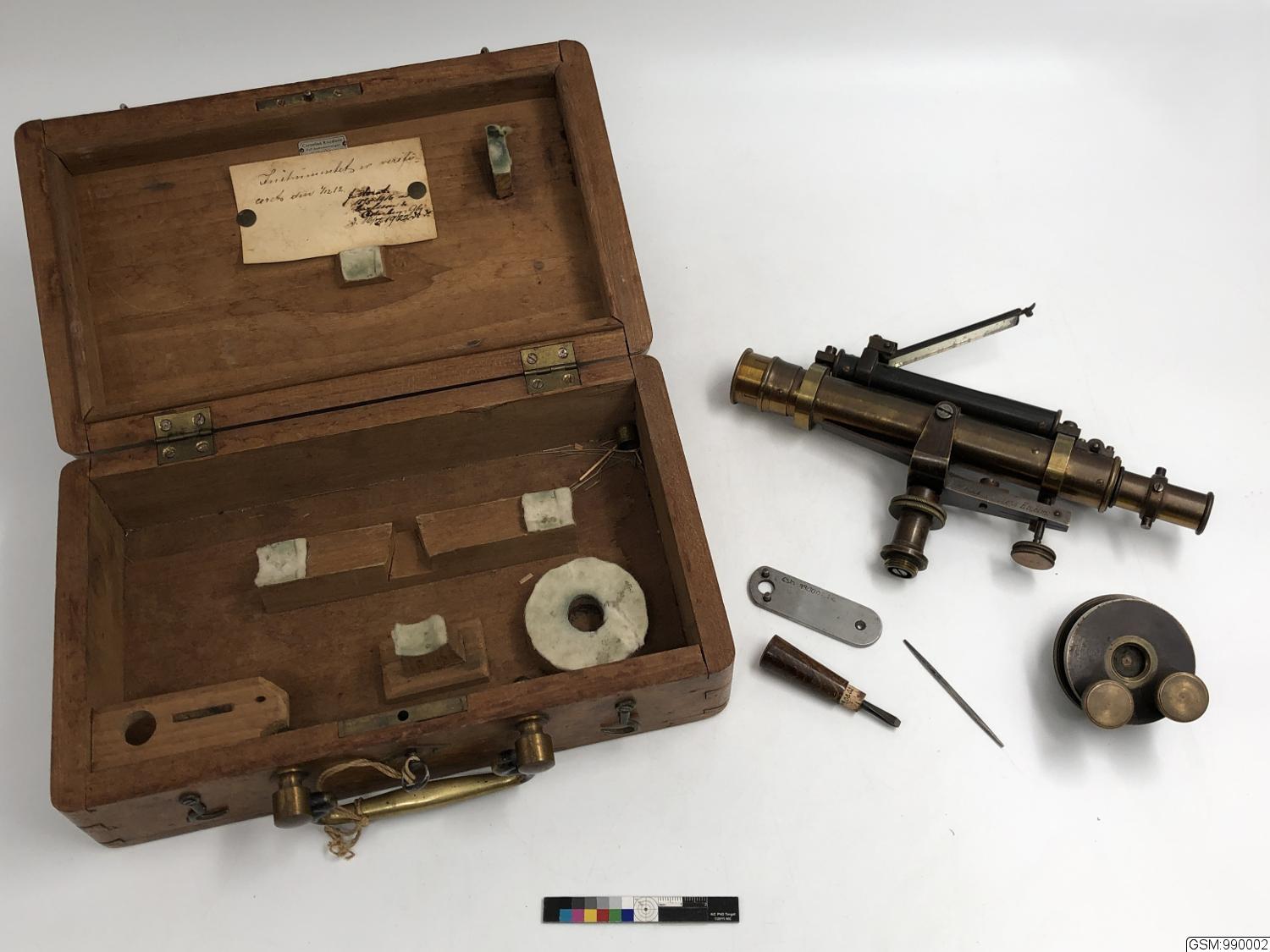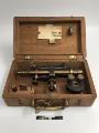 - trälåda innehållande ett avvägningsinstrument (a) och tre tillbehör: justeringsplatta för stativfäste (b), liten metallplatta i vitmetall (c) samt en liten skruvmejsel med träskaft (d). I lådans lock sitter med häftstift ett kort: "Instrumentet er verifierat den 12/12 -12"