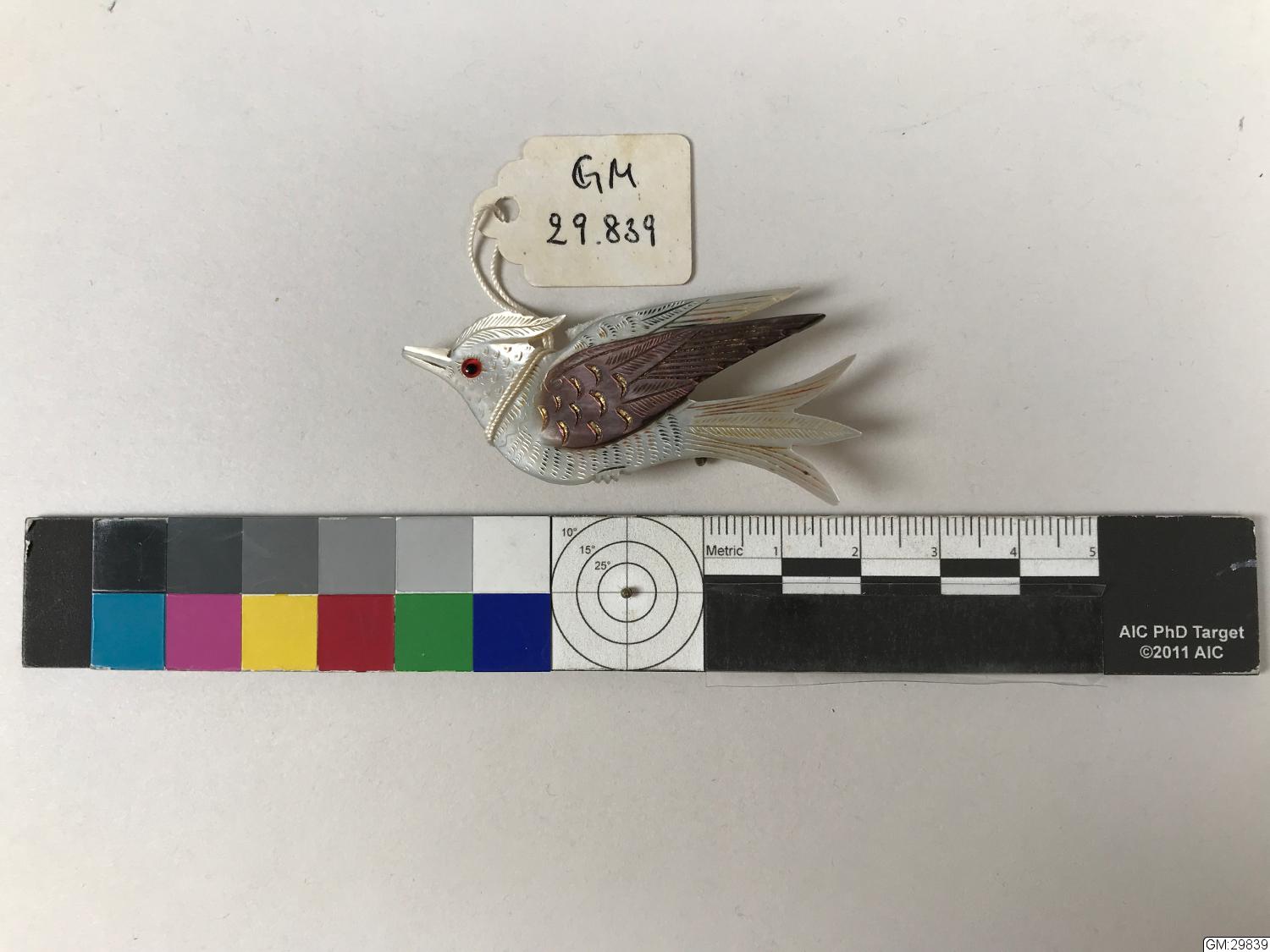 Brosch formad som en fågel pärlemor utskuren så att vingen fått det bruna partiet och öriga fågeln är vit. öga av brunt och svart glas