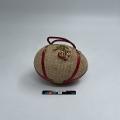 Presentägg, gjort som en väska. Bägge halvorna klädda med grovstrukturerad väv. Ursprungligen har ägget varit nästan vitt, men är nu smutsigt och mörknat. Försett med dekorativa mönsterpressade pappersremsor runt ägget. "Metallspänne" på en av remsorna, ett saknas. På en sida om varsinn ägghalva sitter två röda snoddöglor som handtag. På "framsidan" fäst med metalltråd en körsbärsklase i tunn formpressad och målad metall. Insidan klädd med papper med franska liljor.