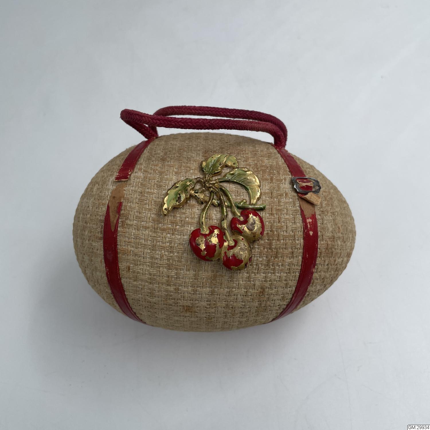 Presentägg, gjort som en väska. Bägge halvorna klädda med grovstrukturerad väv. Ursprungligen har ägget varit nästan vitt, men är nu smutsigt och mörknat. Försett med dekorativa mönsterpressade pappersremsor runt ägget. "Metallspänne" på en av remsorna, ett saknas. På en sida om varsinn ägghalva sitter två röda snoddöglor som handtag. På "framsidan" fäst med metalltråd en körsbärsklase i tunn formpressad och målad metall. Insidan klädd med papper med franska liljor.