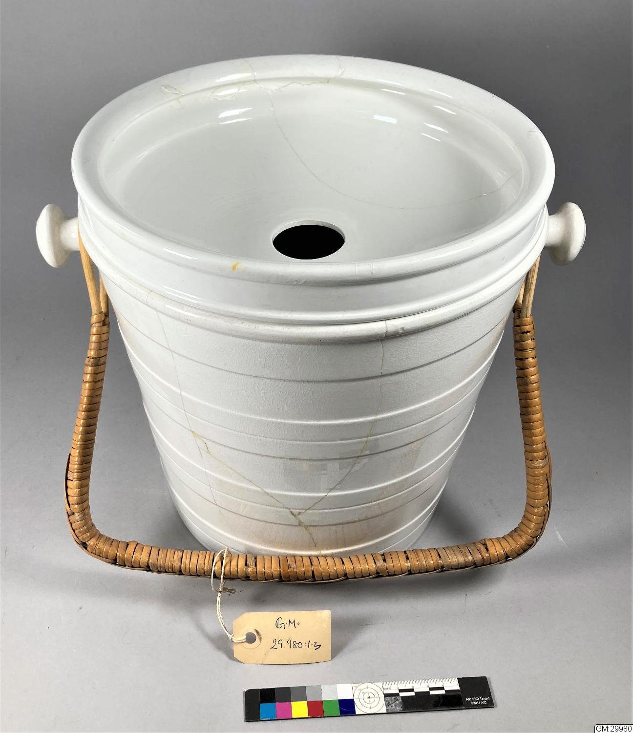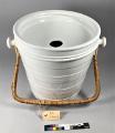 Toaletthink i vitt porslin bestående av :1 hink, :2 insats och :3 handtag. Handtaget i rotting fästs med två öglor kring två knoppformade handtag i hinkens sidor. Hinken har horisontellt relieffad utsida. Insatsen är skålformad med ett runt hål i mitten. Vid beskrivningstillfället var hinken slagen i delar varför det är svårt att få exakta uppgifter. /aan
