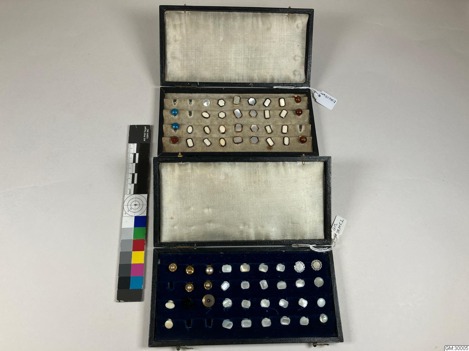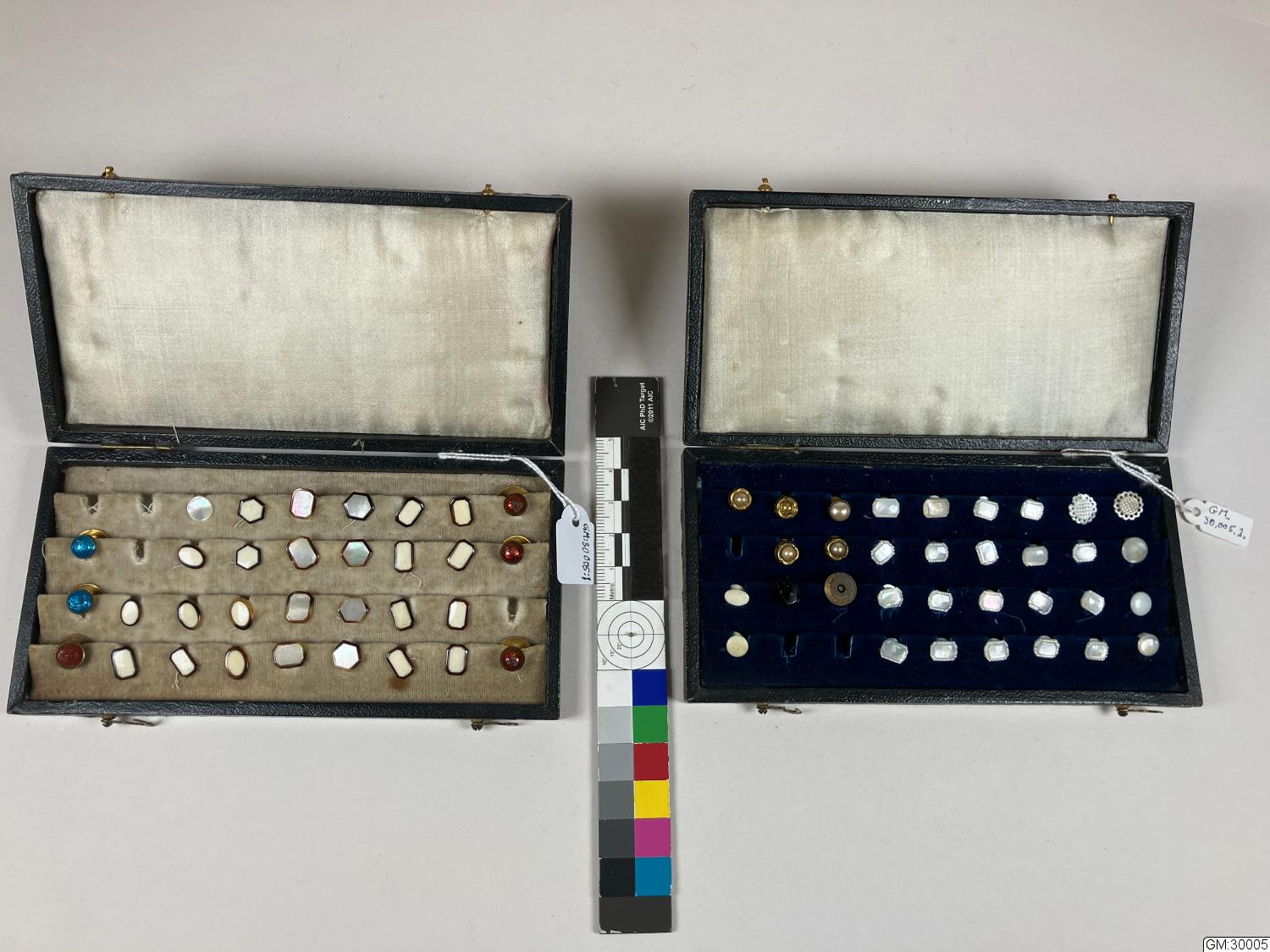 två mörkblå flata etuier innehållande vardera flera små skjortknappar för användning i hårdstärkta skjortbröst. etuierna innehåller både vita och kulörta knappar. Etuiet GM:30005:1 har en etikett, med siffrorna "245" samt blyertsskriften "två askar", klistrad på locket.insidan är ljus. GM:30005:2har mörkblå insida. De flesta skjortknapparna är knappt 1 cm de största är 1 cm.