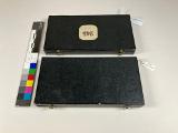 två mörkblå flata etuier innehållande vardera flera små skjortknappar för användning i hårdstärkta skjortbröst. etuierna innehåller både vita och kulörta knappar. Etuiet GM:30005:1 har en etikett, med siffrorna "245" samt blyertsskriften "två askar", klistrad på locket.insidan är ljus. GM:30005:2har mörkblå insida. De flesta skjortknapparna är knappt 1 cm de största är 1 cm.