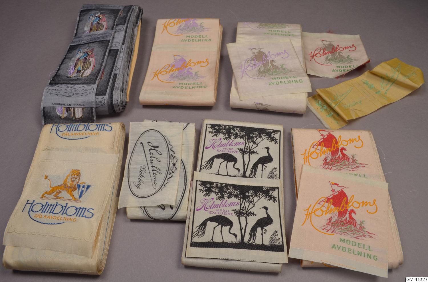 En samling firmaetiketter från Holmbloms för att sy fast på insidan av dräkt från företaget.