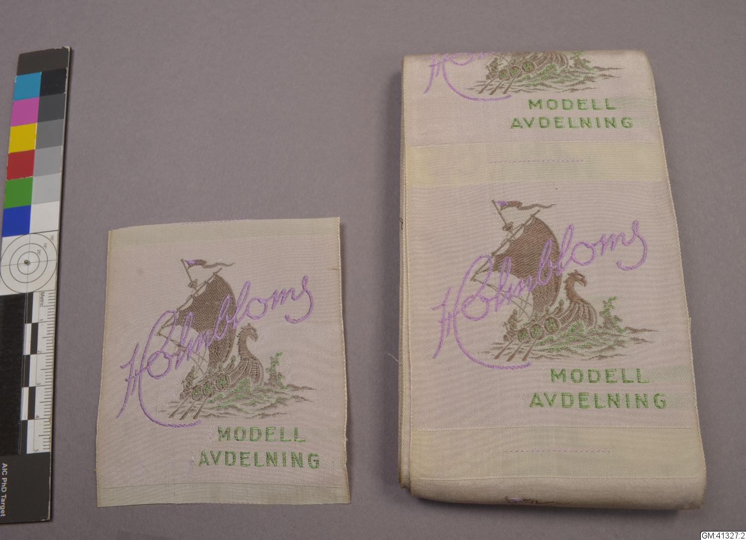 En rulle firmaetiketter från Holmbloms modellavdelning. Vit etikett med motiv av en drakbåt i grått, grönt och lila.