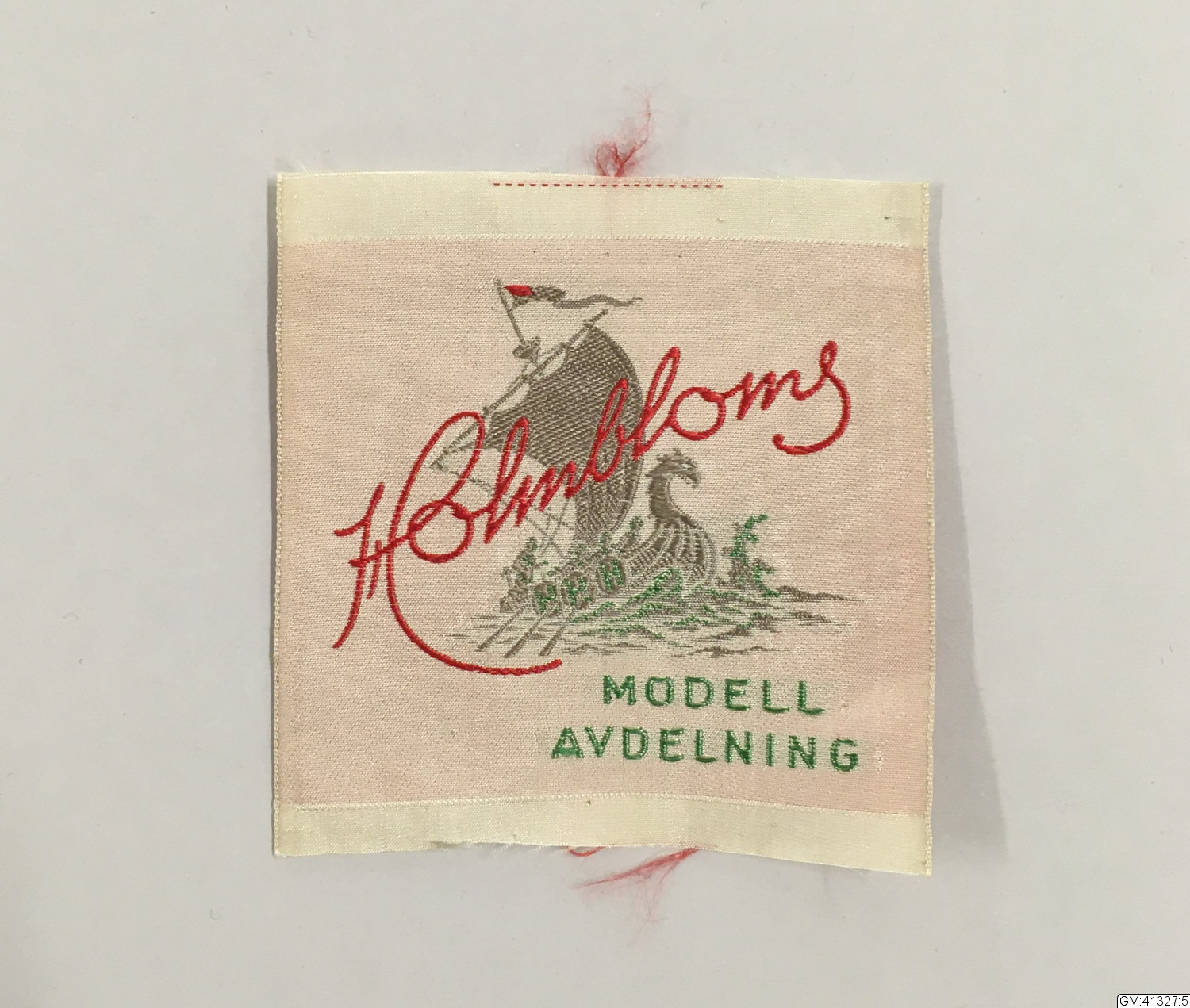 En enstaka firmaetikett från Holmbloms modellavdelning. Vit etikett med motiv av en drakbåt i grått, grönt och rött.