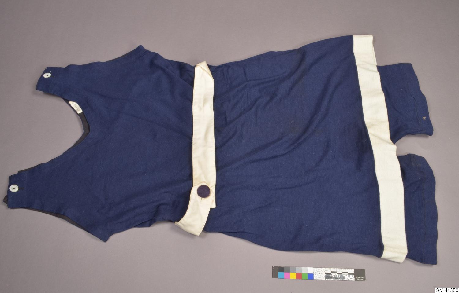 - En baddräkt i mörkblå bomullstrikå med korta ben och överhängande kjol. Baddräkten är utan ärm och v-ringad både fram och bak med knäppning med en knapp på vardera axel. Kjolen har en bandkantning i vitt och i midjan sitter två hällor där det går ett löst skärp i vit bomullssatin med blå knapp.