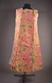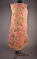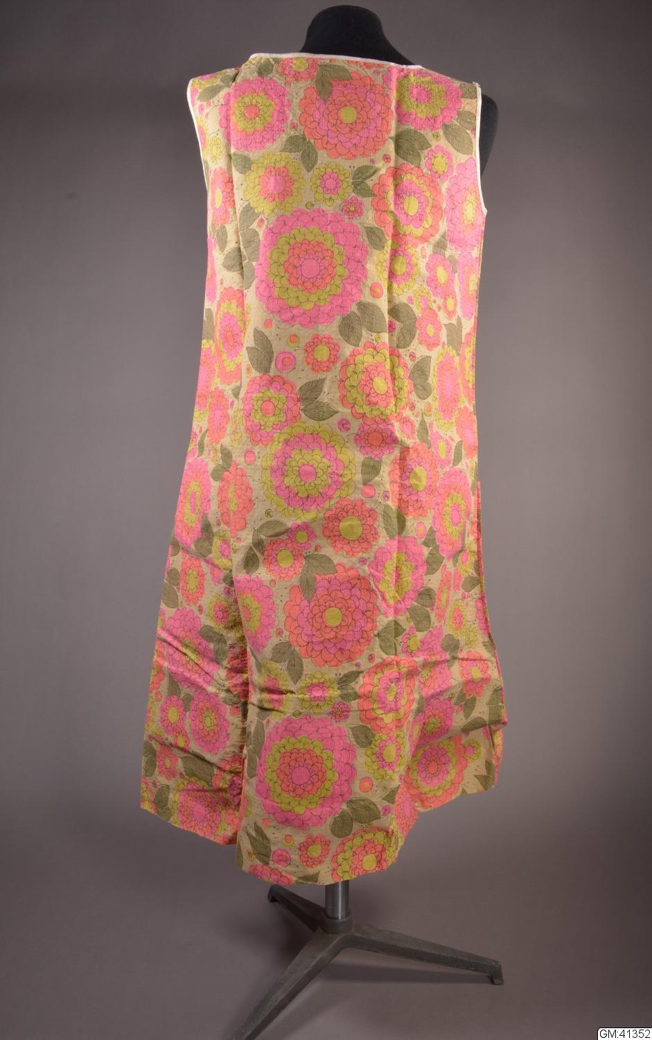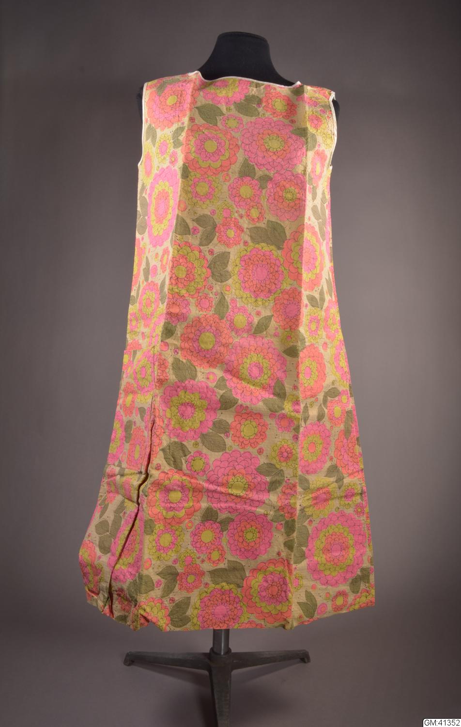 En ärmlös klänning av papper i rak, något utsvängd modell i blommigt mönster i rosa, gult, orange och grönt. Urringnen är rak med vit bandkantning längs med urringning är armhål.