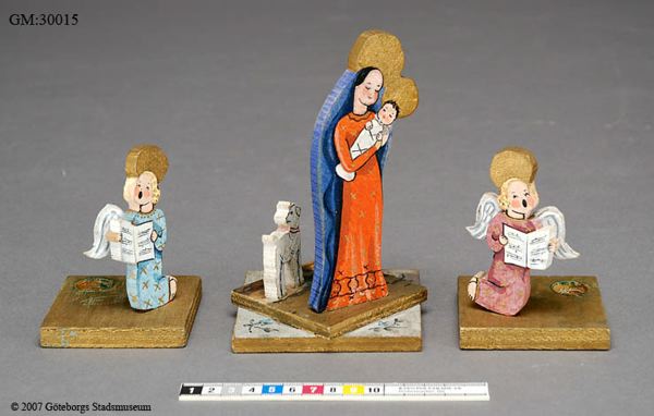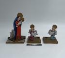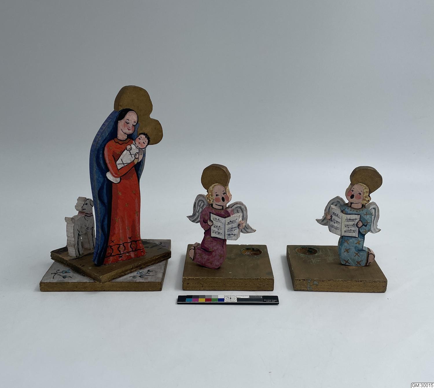 3 st ljusstakar av trä i form av Maria med Jesusbarnet och ett lamm samt två sjungande änglar. Gåva från Irma Anna Hartzell 1973.