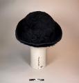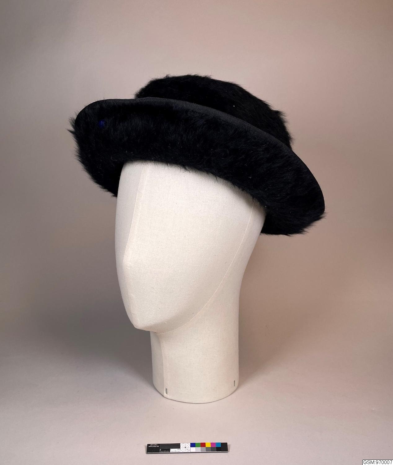 Damhatt, av extra "långhårig" svart melusin, Breton modell, ganska låg kulle litet mjukt rundat uppvikt brätte. Brättet är förstärkt med karkas i i ytterkanten karkasen döljs av det svarta ripsband som kantar brättet. Blå fasseterad strass-sten framtill på brättet, och liten hattnål i nacken . Hattnålens huvud är klätt med svart ripsband. Svettrem av svart ripsband. Rut Asplund var mycket förtjust i hatt Göstas modeller och köpte så många hattar därifrån att hennes dotter skämtade; att det säkert drev hela verksamheten.