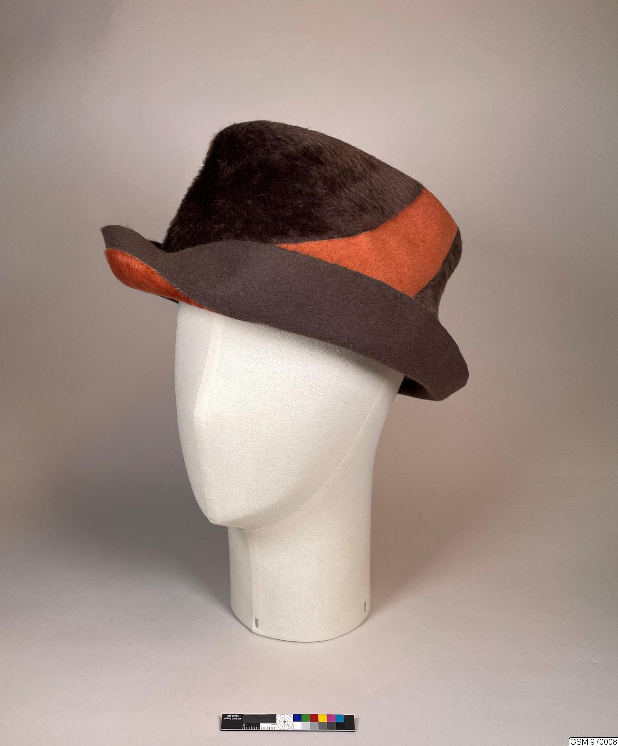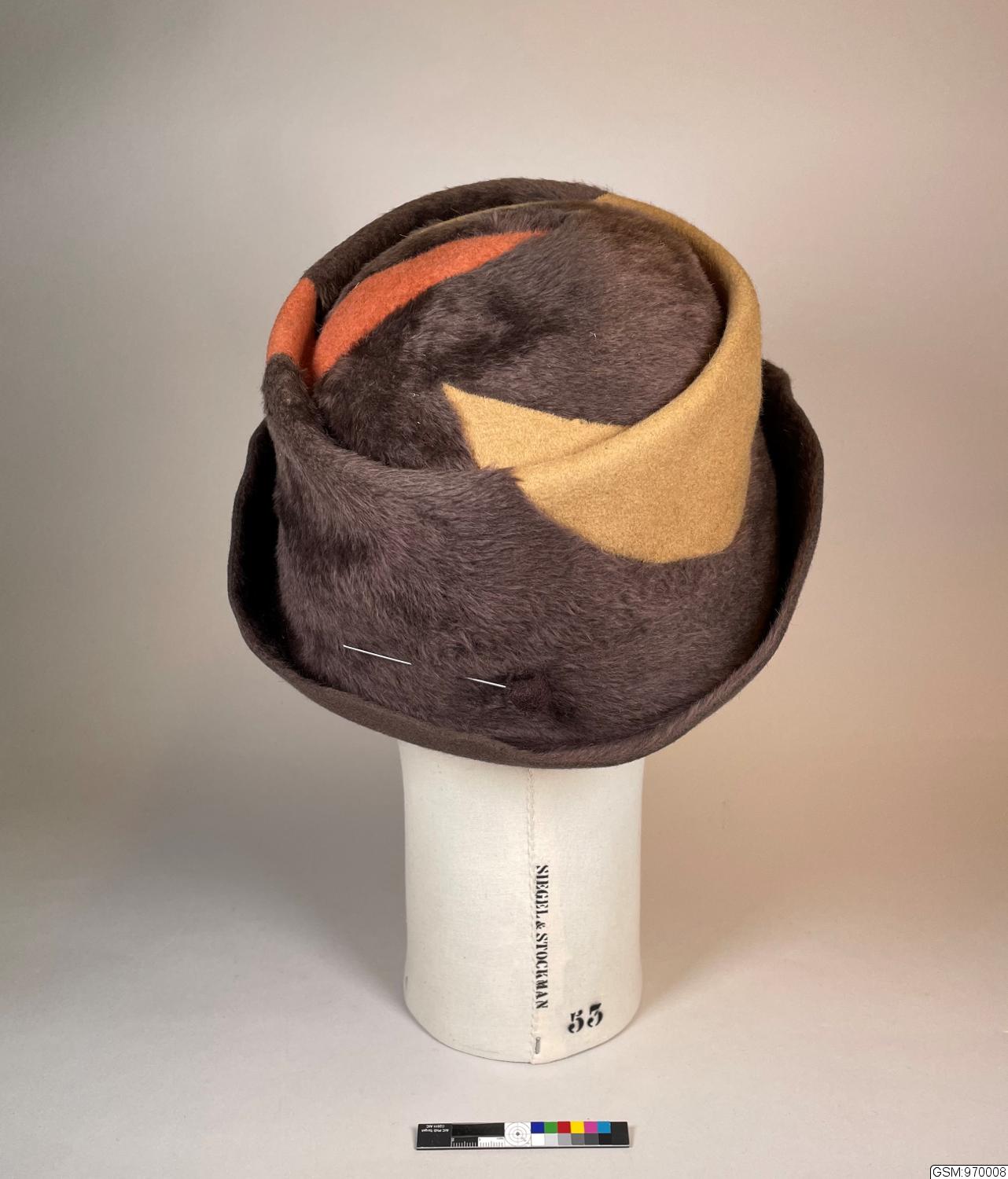 Damhatt, av brun, ockragul och tegelröd melusin, "pork pie" modell, rund kulle med fåra runt takets kant och litet uppvikt brätte. Dekorerad genom att virvlar av ockragul och tegelröd melusin fälts in med skarvsöm i den bruna melusinen innan hatten formades. den bruna melusinen och de två andra färgerna har lagts med den håriga sidan åt olika håll; liten hattnål i nacken . Hattnålens huvud är klätt med brun filt. Svettrem av brunt ripsband. Rut Asplund var mycket förtjust i hatt Göstas modeller och köpte så många hattar därifrån att hennes dotter skämtade; att det säkert drev hela verksamheten.