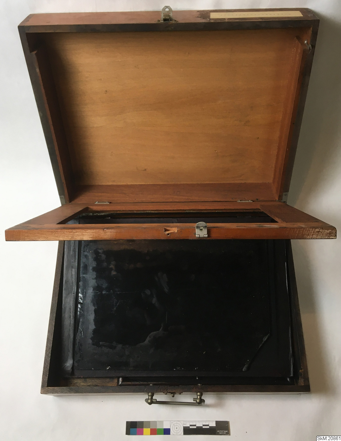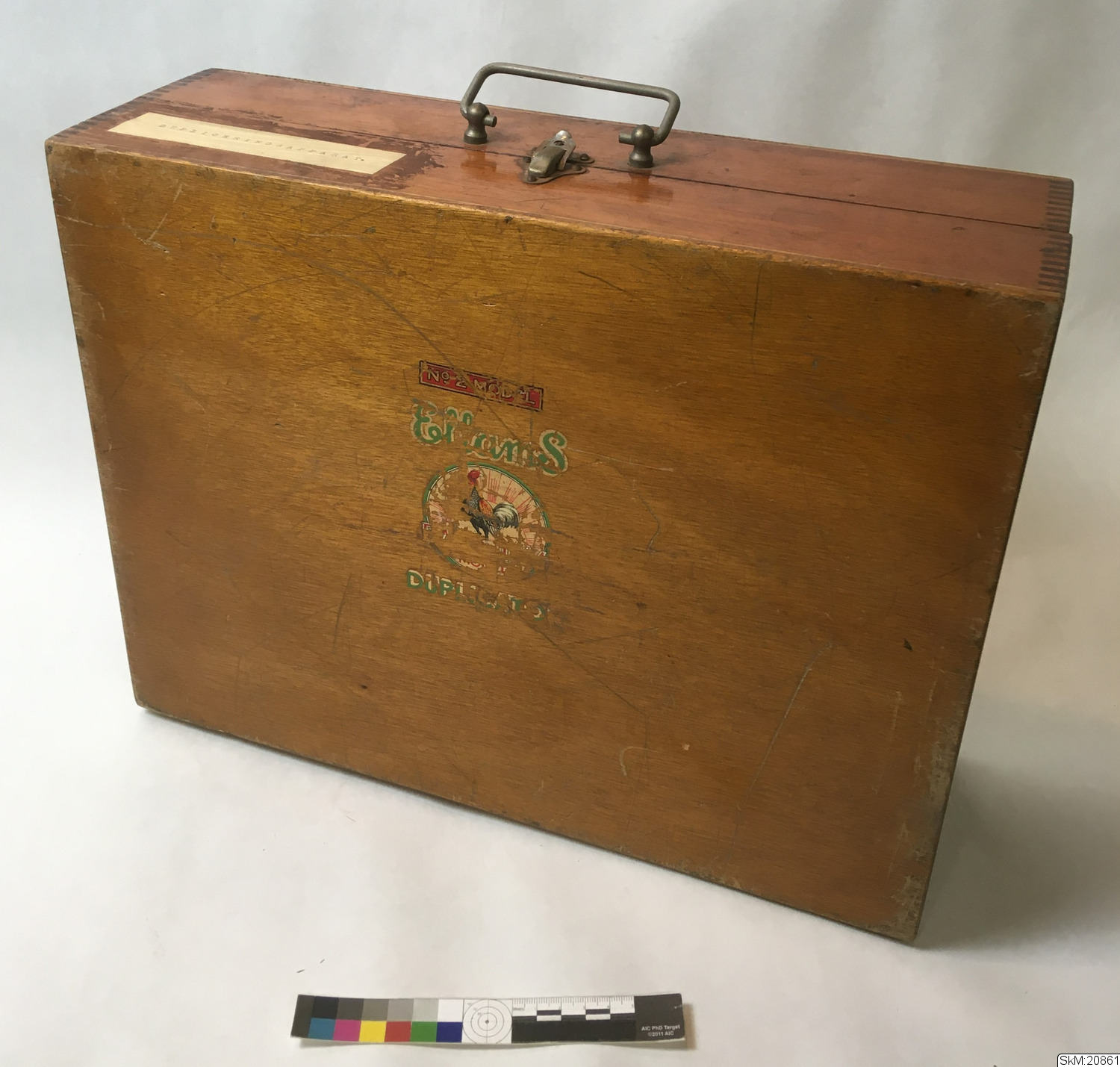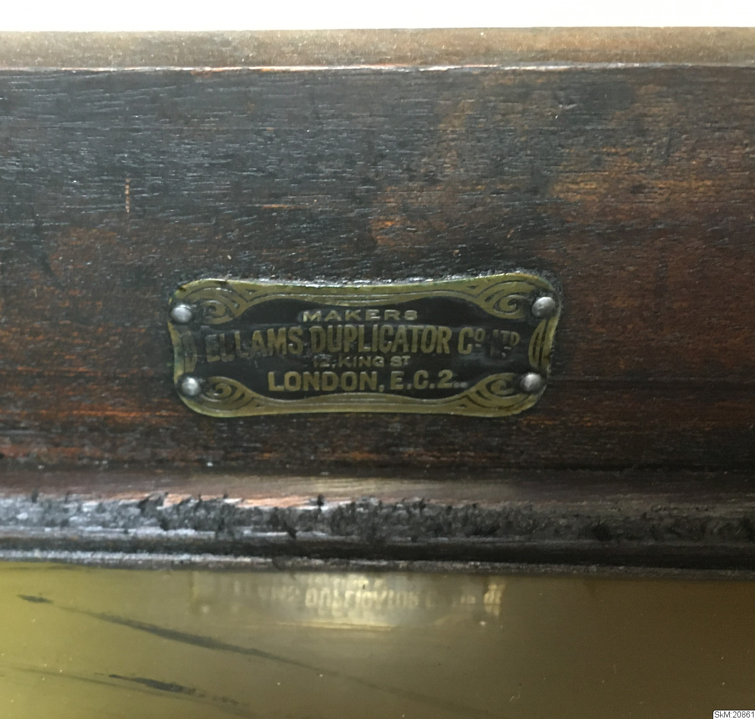 - dupliceringsapparat, tillvberkad i Storbritannien, brunbetsad trälåda, ca 1910-20. Ellams Duplicator No 2 Model