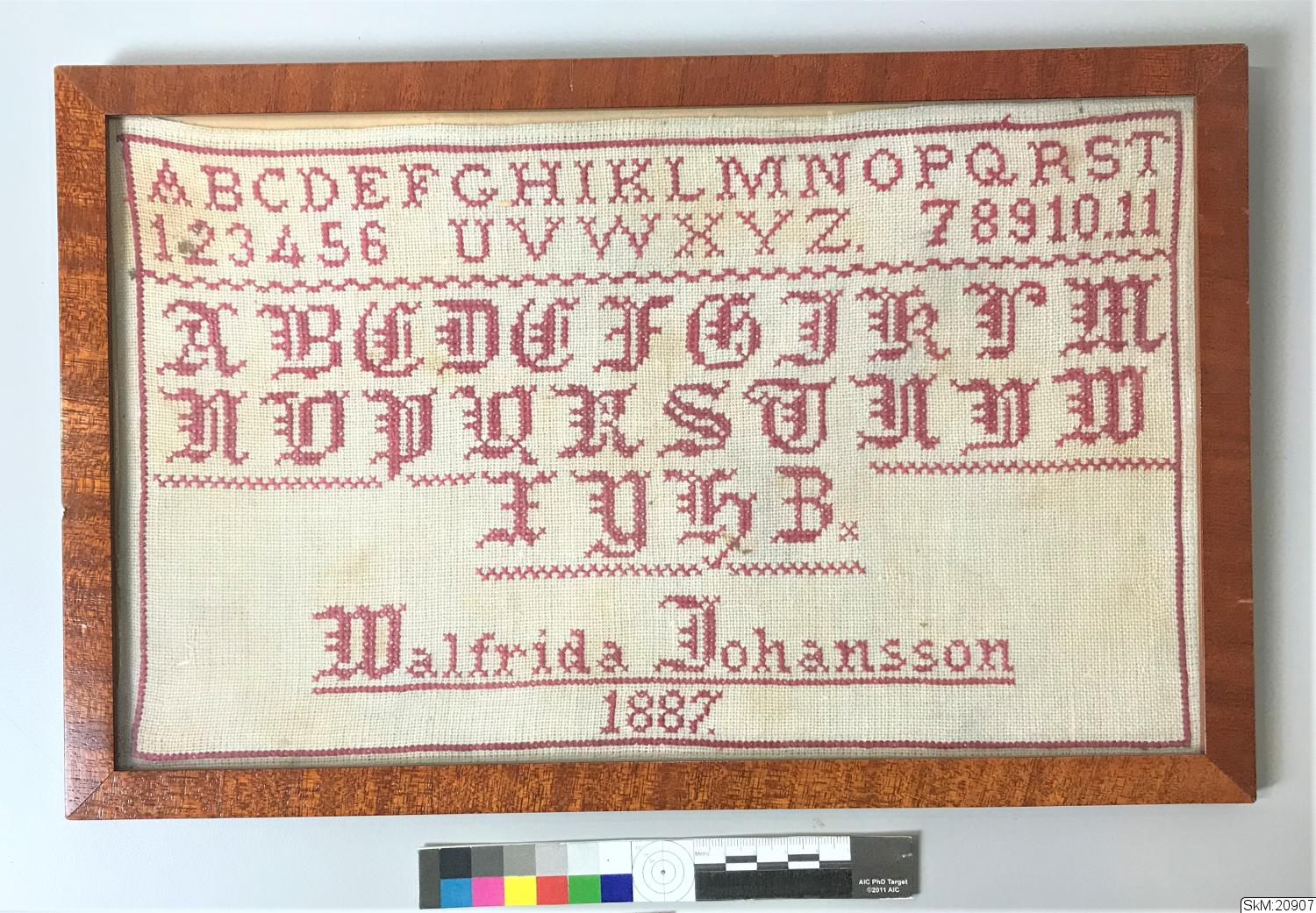 märkduk sydd av Frida Johansson, född 12/10-1875, Norra Larmgartan, Nordstan, Göteborg. Under ledning av handarbetslärarinnan fröken Barkman, skola på gamla Otterhällan.