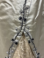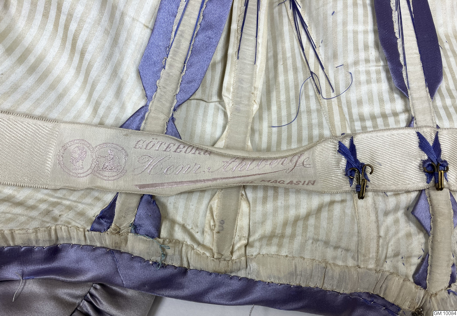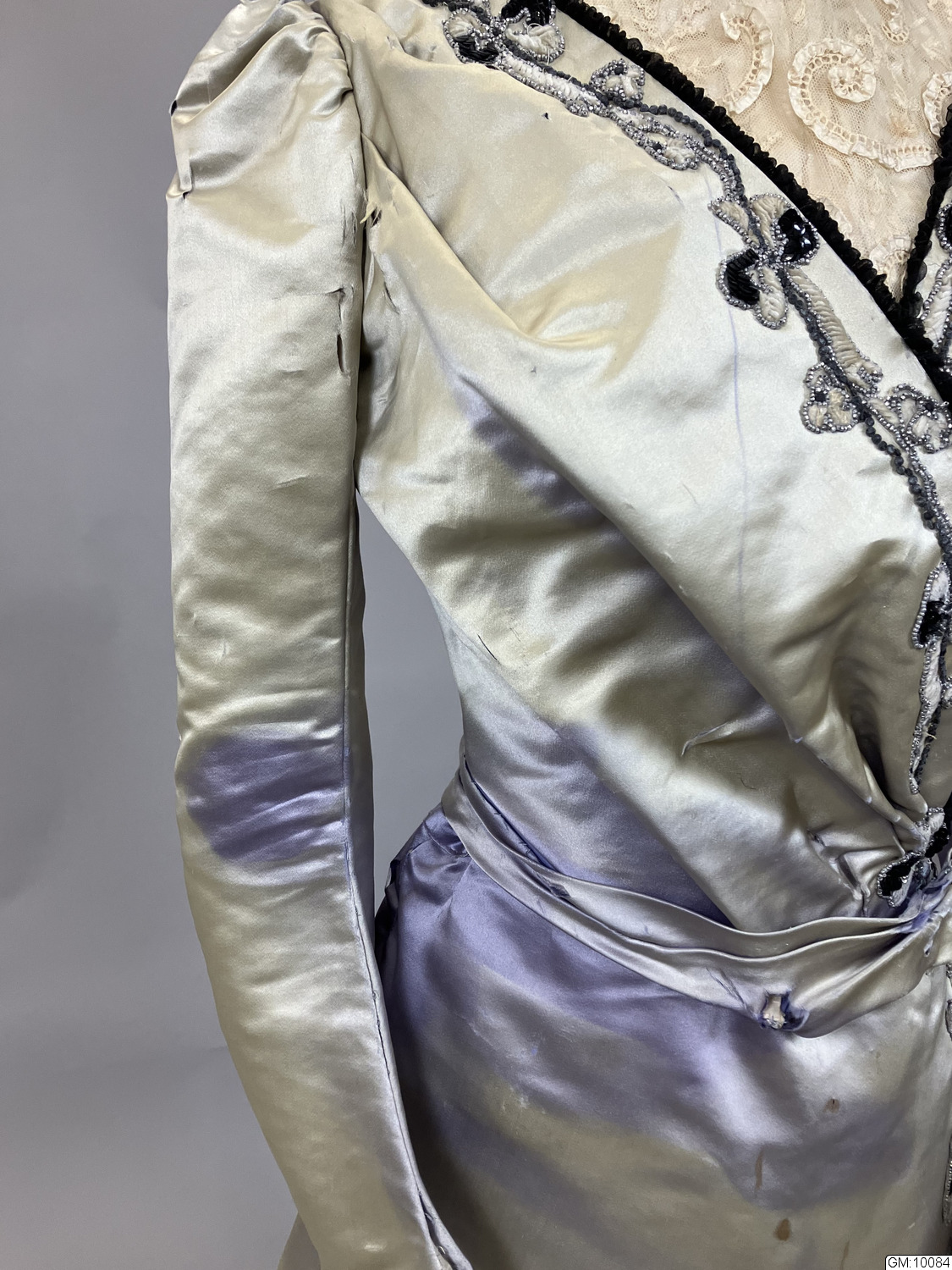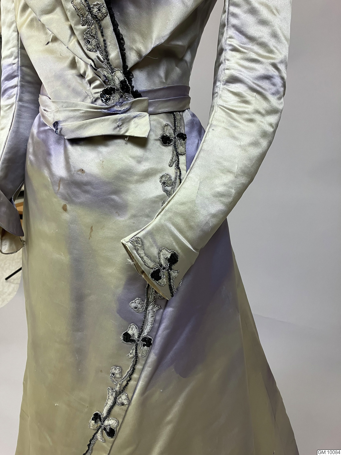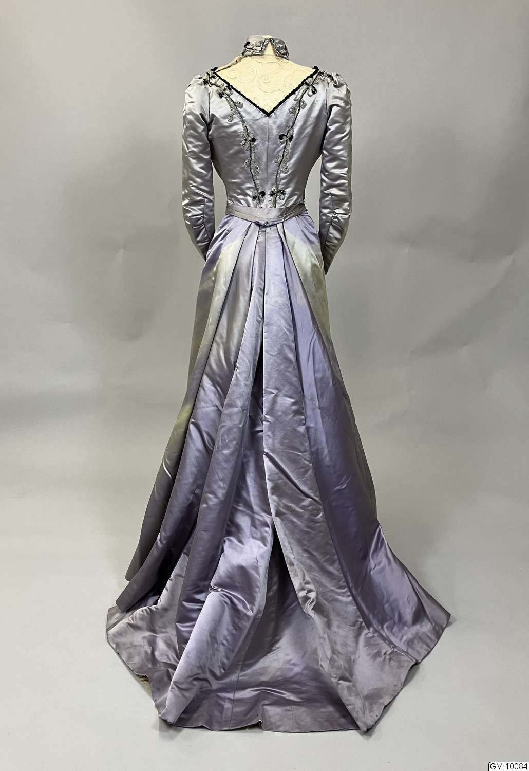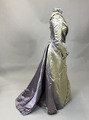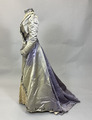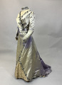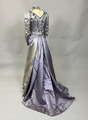 Hellång klänning i lila sidenatlas bestående av liv och kjol. Livet är korsetterat med lång avsmalnande ärm och hög krage. Dekorerad med pärlbroderade bårder av pärlor och paljetter i silver och svart. Spetsisättning som går upp i höghalsad krage. Foderliv i bomull och knäppning mitt fram med dold knäppning. Kjolen är hellång med stor vid bak och med långt släp. Helfodrad i siden med släpvolang. Knäppning mitt bak med hyskor och hakar. Dekorerad med samma pärlbroderad bård som livet och spetsisättning mitt fram nedtill på kjolen. Sidentyget har blivit kraftigt blekt.