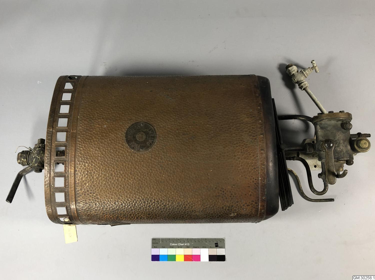 1. Balje av hamrad kopparplåt. På tryckt 'Prof Junkers Patent'. Gasuppvarmingsapparat. 2-3. Från Hedåsgatan 6, där Ragnar och Agnes Malm bodde, 4 rum och kök, hall och badrum. Huset byggt 1913 och badrum fanns från början.