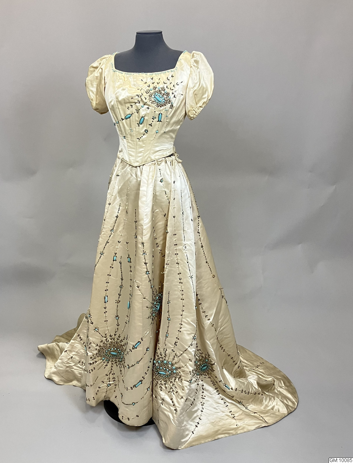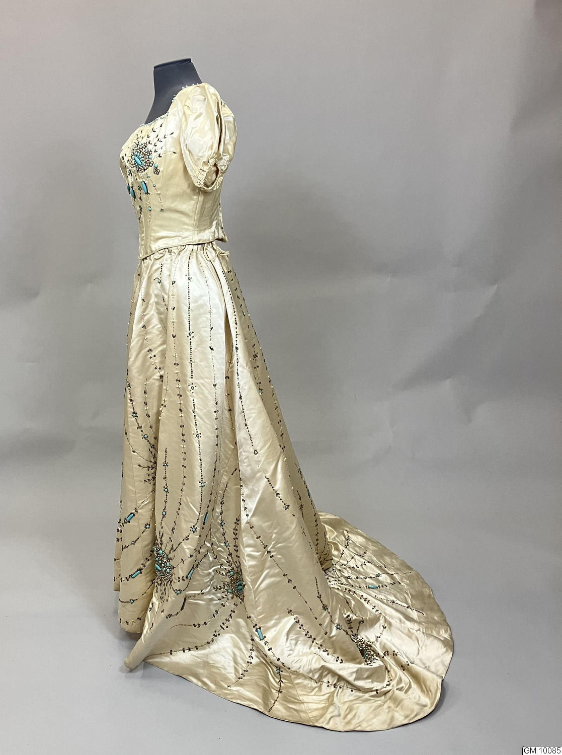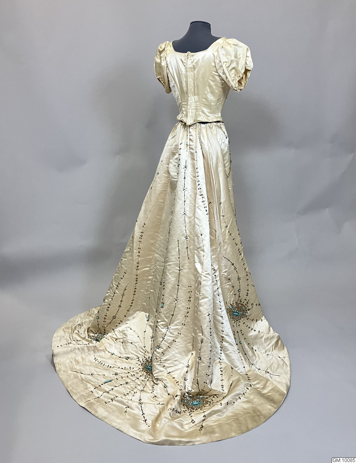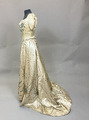 - Aftonklänning bestående av liv och kjol i cremefärgad sidensatin rikt dekorerad med pärlbroderier i turkost, vitt och silver som täcker stora delar av kjolen och livets framstycke. Kjolen har klockad form och långt släp, ofodrat. Livet är korsetterat, har rund urringning, kort puffad ärm och knäppes med hyskor och hakar mitt bak.