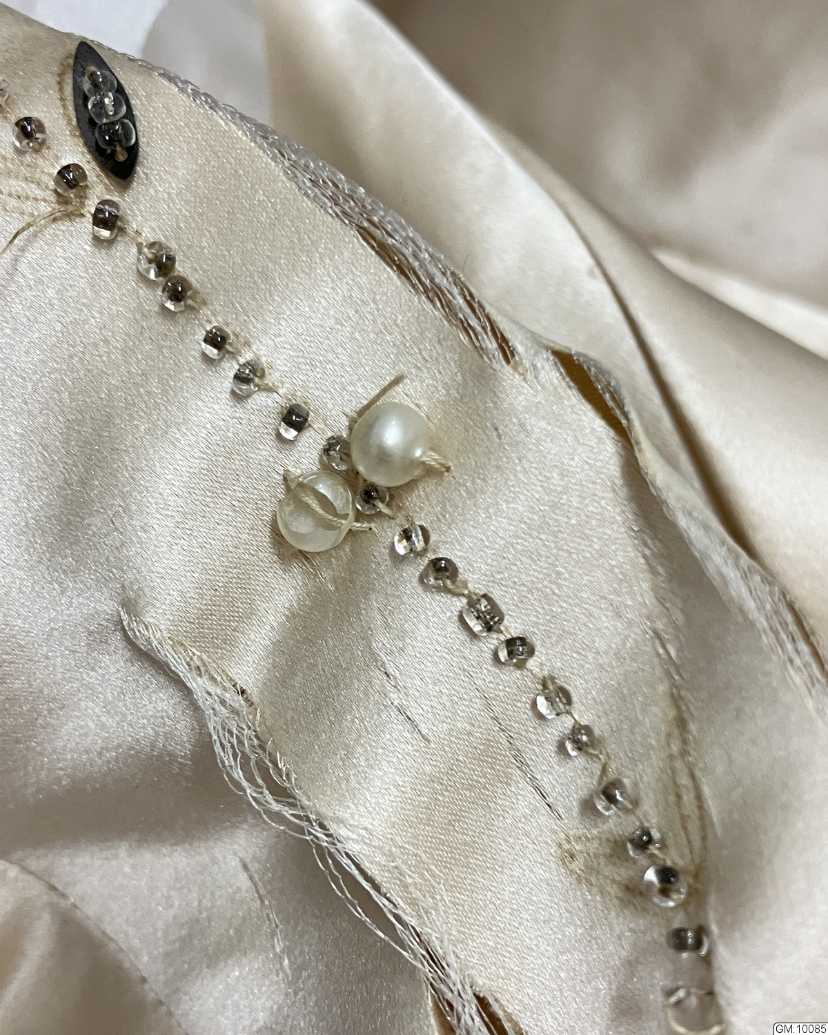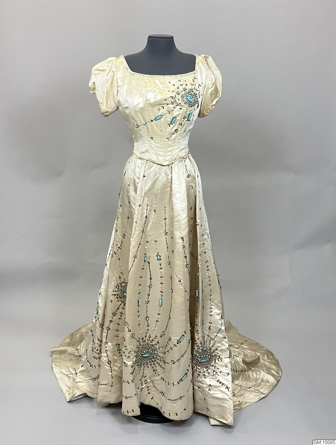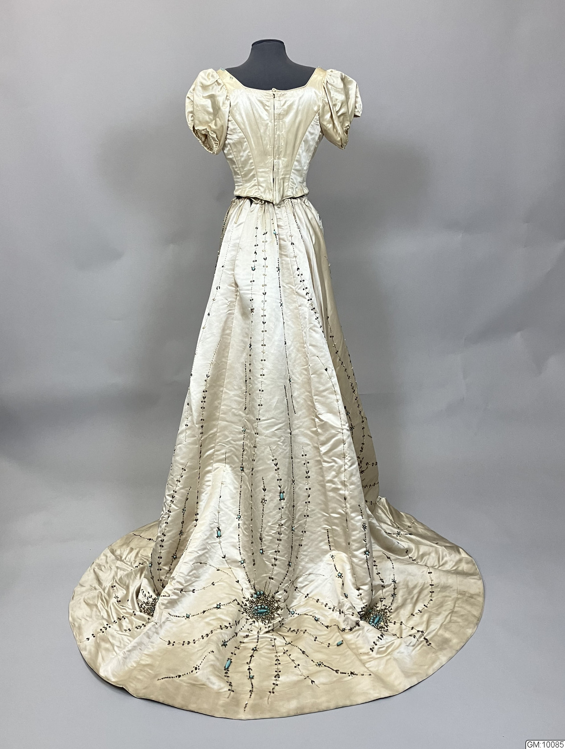 - Aftonklänning bestående av liv och kjol i cremefärgad sidensatin rikt dekorerad med pärlbroderier i turkost, vitt och silver som täcker stora delar av kjolen och livets framstycke. Kjolen har klockad form och långt släp, ofodrat. Livet är korsetterat, har rund urringning, kort puffad ärm och knäppes med hyskor och hakar mitt bak.