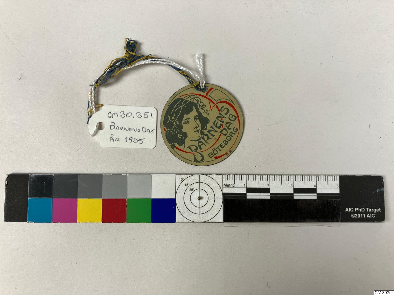 En rund plåtplatta med färgtryck i grågrönt och rött mot beige botten ett barnhuvud i trekvartsprofil. slingor samt text "barnens dag Göteborg" allt i jugendstil.