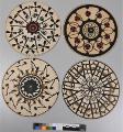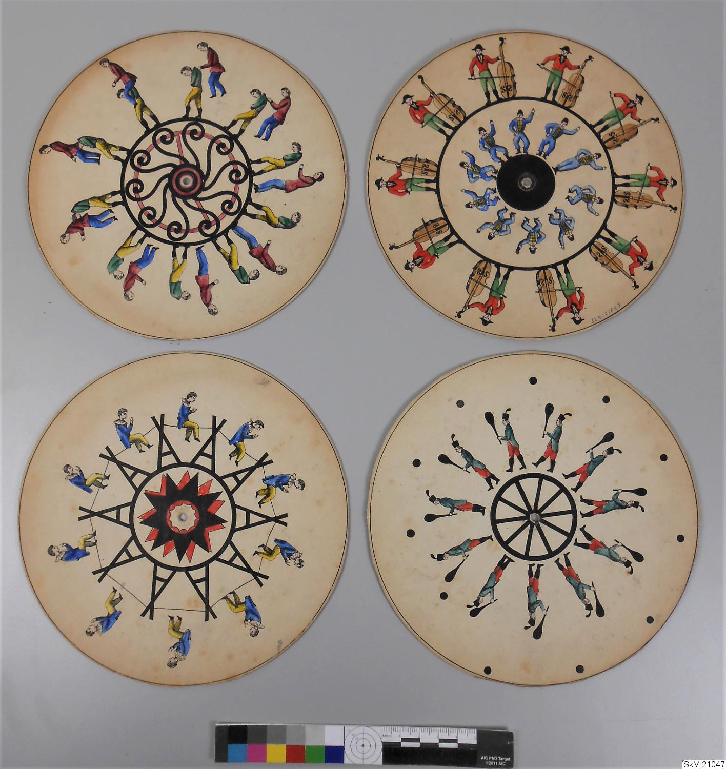 fyra färgskivor, med handkolorerade figurer och människor. Ev. använda som åskådningsmedel i fysik, rörlig film.