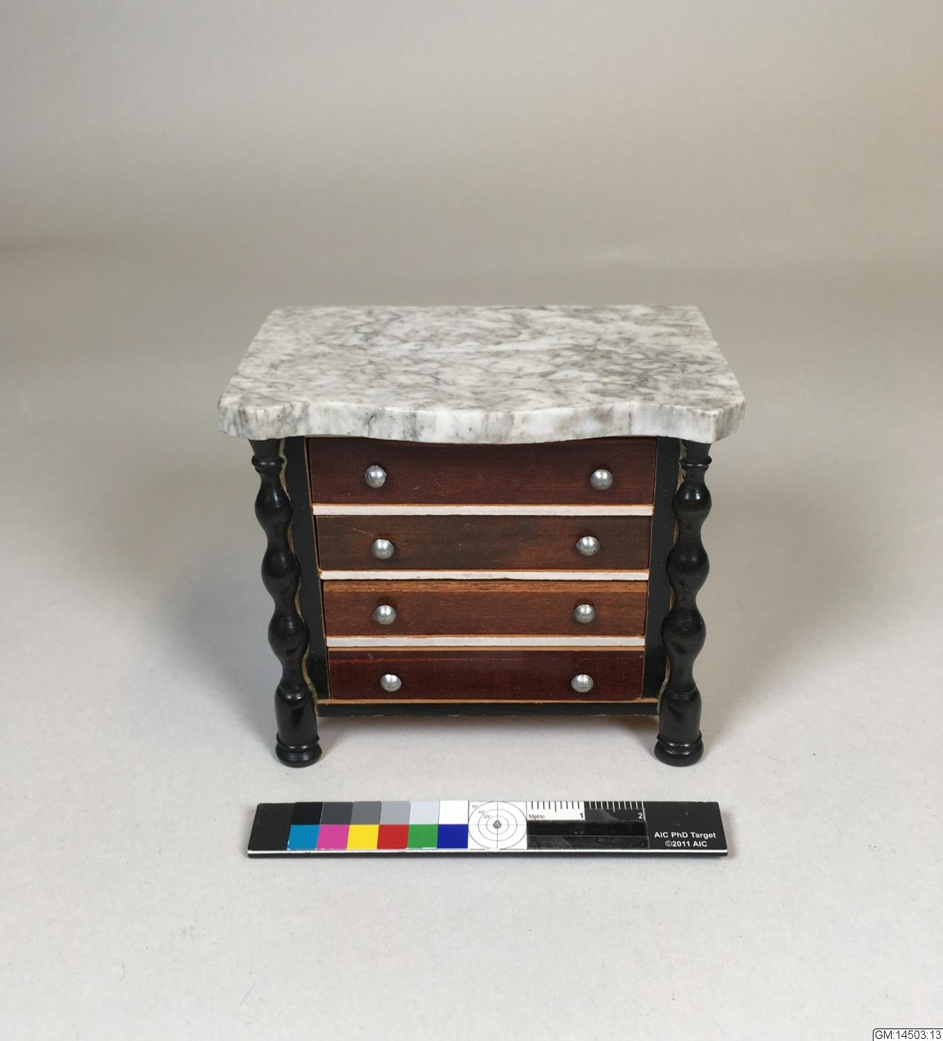 Byrå i mörkbrunt trä med skiva av marmor och fyra utdragbara lådor.