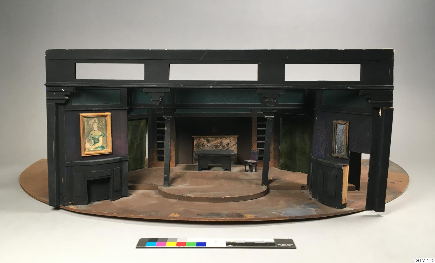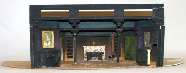 - Rum med mörkbruna paneler och mörklila väggfält på båda sidor och sammanbundna av en tvärgående mörkbrun bjälke, på vänster sida öppen spis med ett porträtt över, mitten av scengolvet är något uppbyggt och utsvängt, golvet för övrigt är brunt och parkettmönstrat och har en pelare på var sida, i bakgrunden gröna sidoväggar (av grön manchester), fondväggen har en stor karta och bokhyllor på var sida om den, framför står ett bord och en stol.