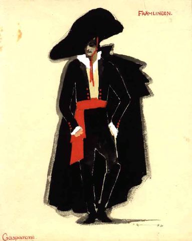 - Man i vit skorta med spetskrage och manschetter, svart bolero-jacka med röda knappar, rött, knutet skärp på höften, svarta byxor, svarta stövlar, svart, vidbrättad hatt med rött hakband, svart mantel.