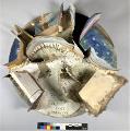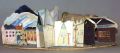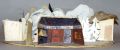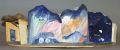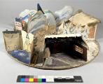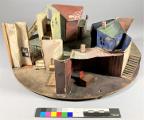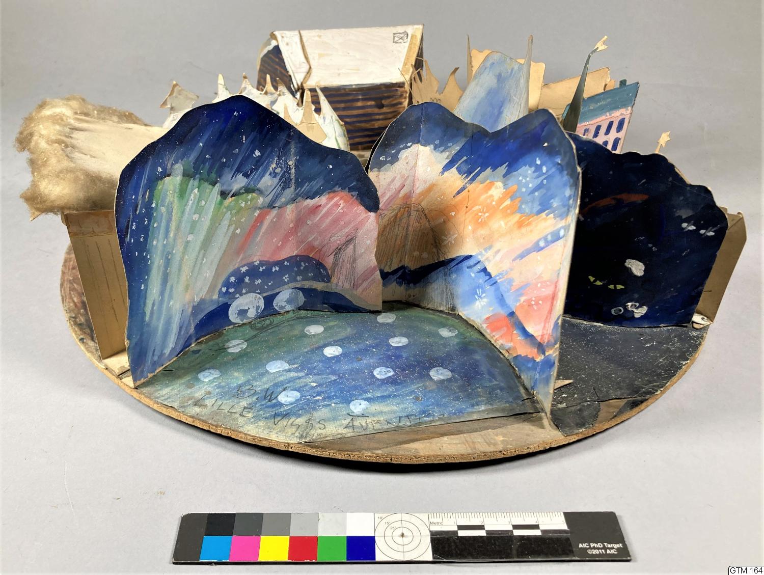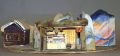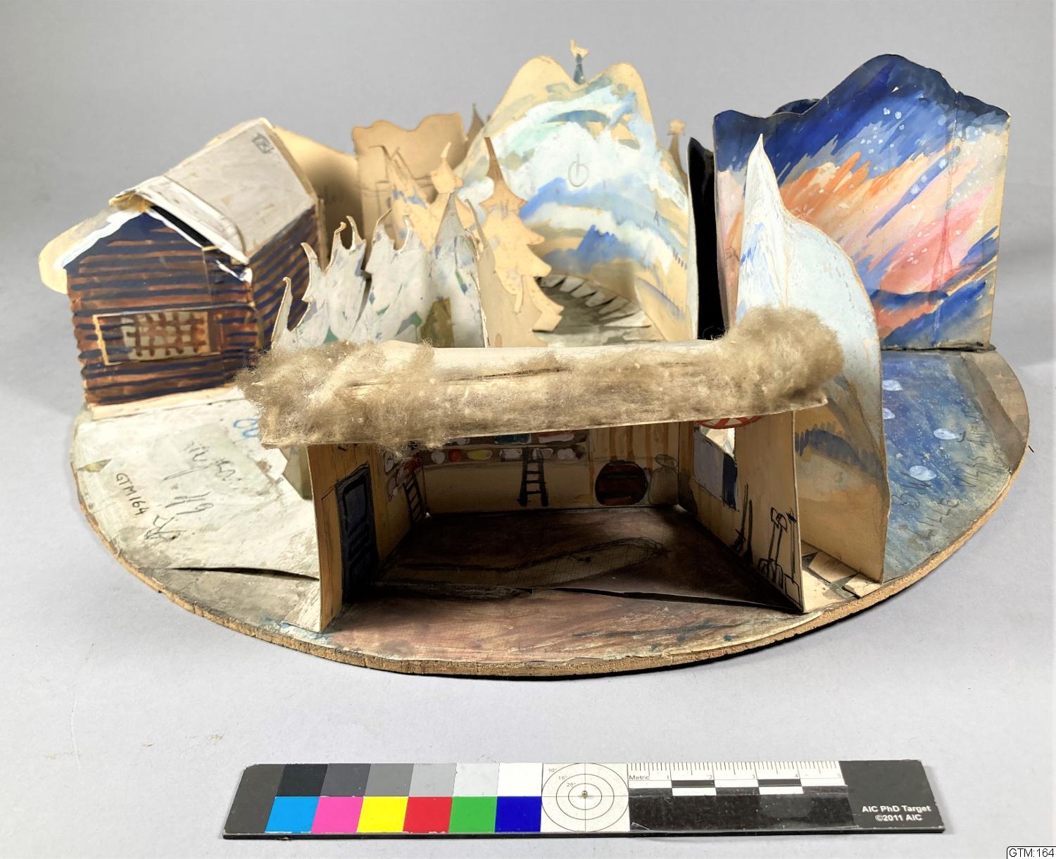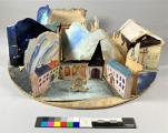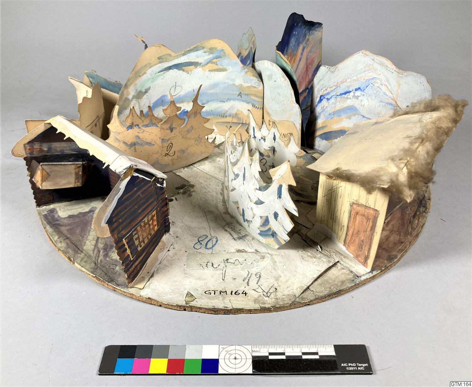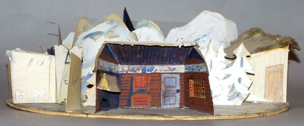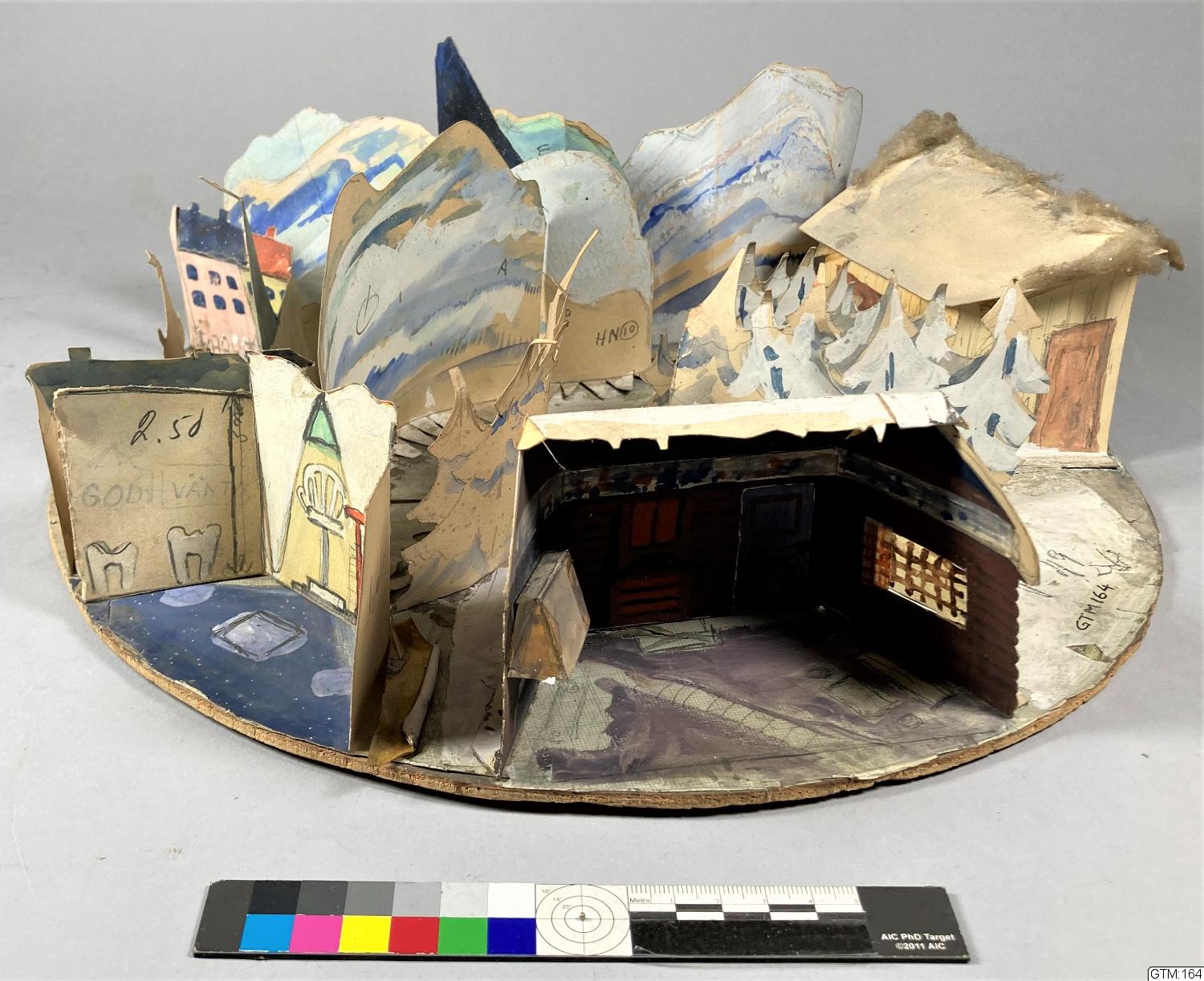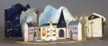 - rund grundplatta med pålimmat graderingspapper, trol fem scenbilder, som består av _a: handelsbod med varor på hyllor och från tak. _b: bergslandskap och himmel i pastellfärger. _c: torg med kyrka i mitten, hus på båda sidor och julgran mitt på torget. _d: med text GOD VÄNTA _e: interiör av timrad stuga med spiskupa på vänster sida, fönster på höger sida, skåp och dörr på mittväggen. Snöiga granar mellan scenbilderna.