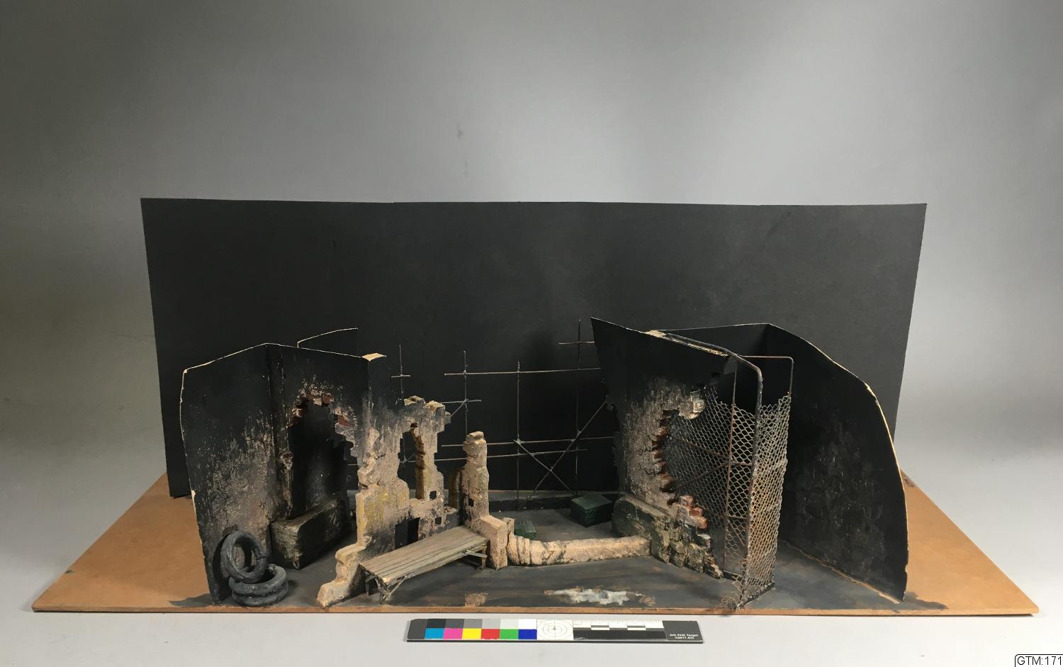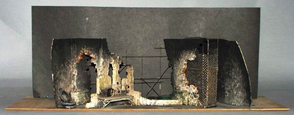 - Delvis raserade murar av tegel som till vänster har en portal, tre bildäck upplagda vid sidan, en träbänk t h därom, på höger sida är en nätvägg monterad i den trasiga muren framför utrymmet bakom, i fonden en hög stålkonstruktion, svart horisont.