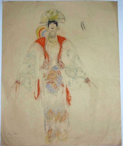 - Kvinna i i blus med vida, dekorativt mönstrade ärmar i ljus turkos och åtsittande manschetter i rött, röd,insvängd mönstrad väst, lång kjol, rikt dekorerad framtill med mönster i rött, gult. blått, orange och längst ned på kjolen mönster i gult-orange, halssmycke, örhängen och hårprydnad i gult med olikfärgade band.