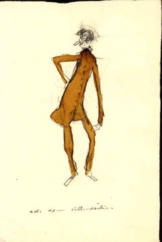 Man med lång näsa i brun kostym, lutad med ena handen mot vänster knä, den andra i sidan.