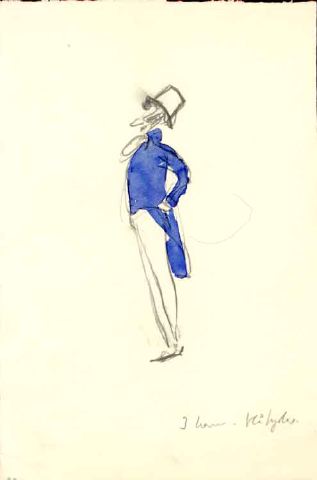 Man med lång näsa, stående i profil med handen i sidan, i hög hatt, blå rock med skört, halskrås, åtsittande byxor.