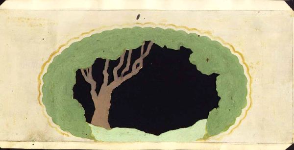 - En utskuren fond med oval form inramat i två gröna nyanser och en lutande trädstam i brunt på vänster sida. Skissen är limmad på kartong och har vik-eller limkanter. ( Bakomvarande fond är GTM:2224)